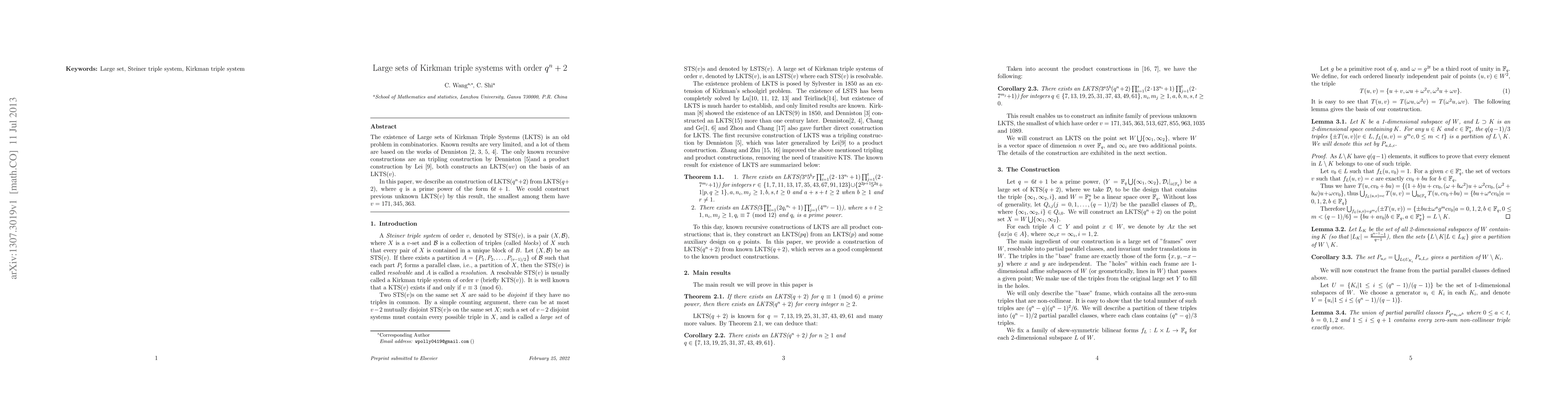 The existence of Large sets of Kirkman Triple Systems (LKTS) is an old problem in combinatorics. Known results are very limited, and a lot of them are based on the works of Denniston \cite{MR0349416, MR0369086, MR535159, MR539718}. The only known recursive constructions are an tripling construction by Denniston \cite{MR535159}and a product construction by Lei \cite{MR1931492}, both constructs an LKTS($uv$) on the basis of an LKTS($v$). In this paper, we describe an construction of LKTS$(q^n+2)$ from LKTS$(q+2)$, where $q$ is a prime power of the form $6t+1$. We could construct previous unknown LKTS($v$) by this result, the smallest among them have $v=171,345,363$.