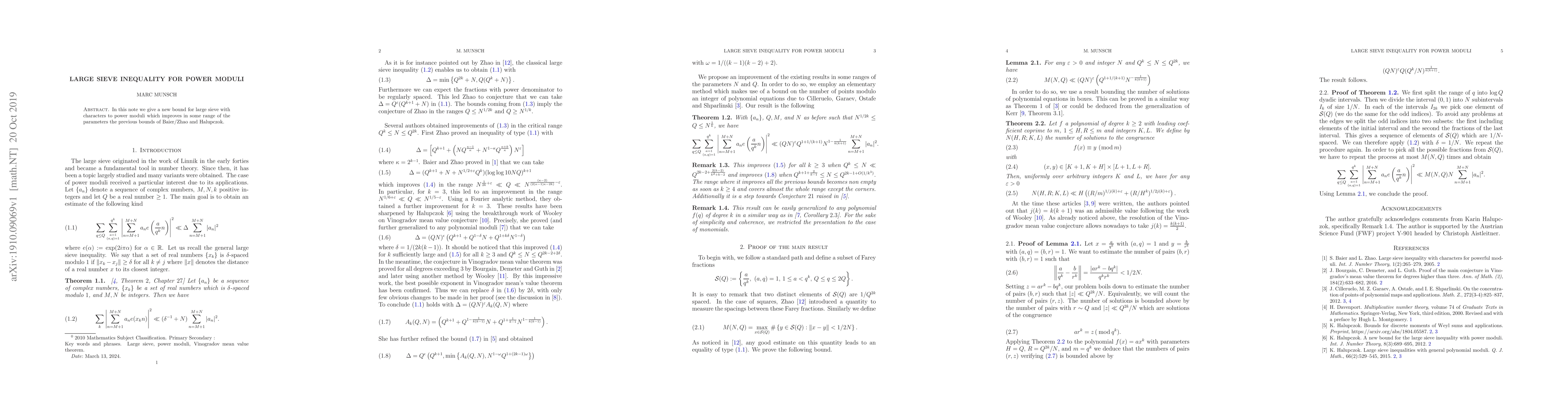 Summary: This paper presents a new bound for the large sieve inequality involving characters to power moduli, surpassing previous bounds established by Baier/Zhao and Halupczok in certain parameter ranges.