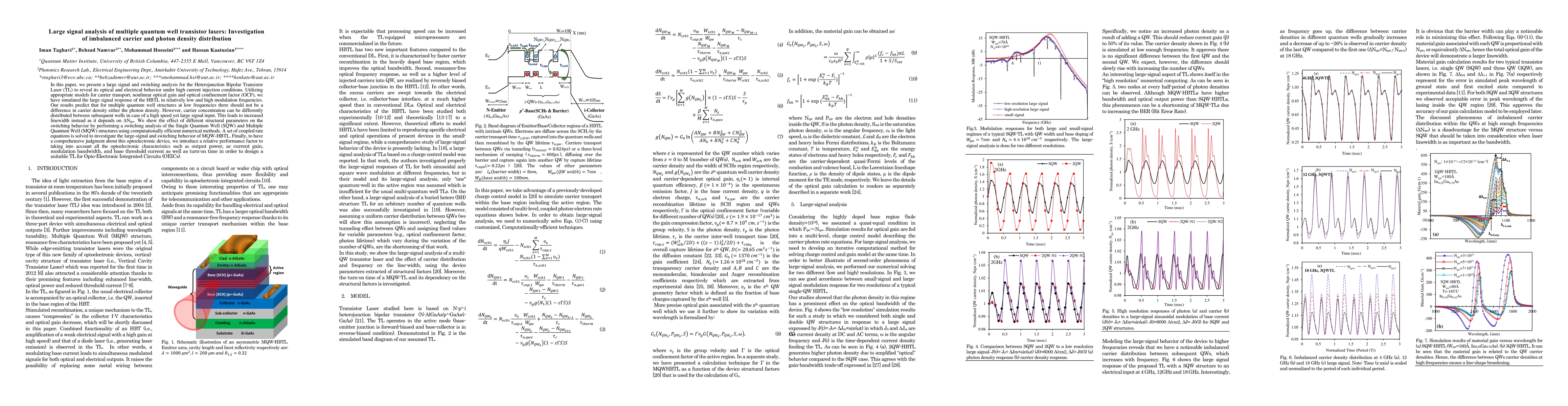 This paper analyzes the behavior of multiple quantum well transistor lasers under high current injection conditions, finding that carrier density distribution affects linewidth at low frequencies.