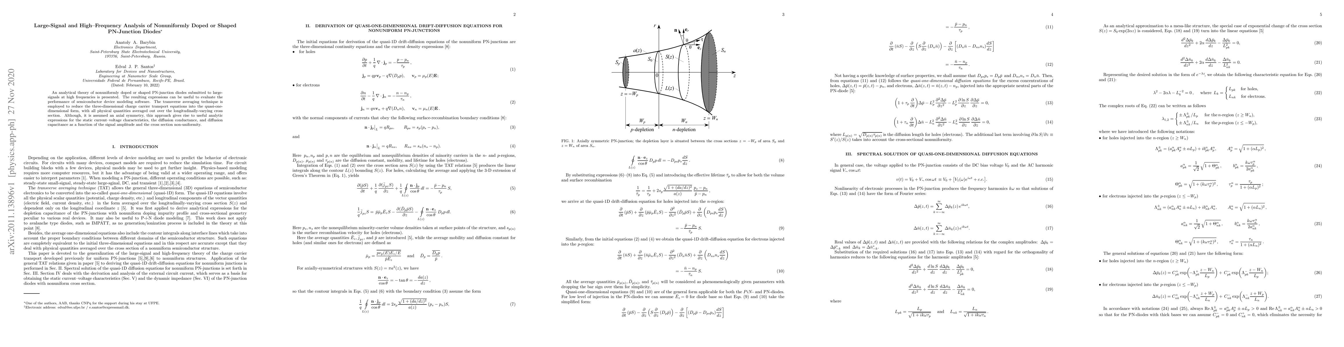 An analytical theory of non-uniformly doped or shaped PN-junction diodes submitted to large-signals at high frequencies is presented. The resulting expressions can be useful to evaluate the performance of semiconductor device modeling software. The transverse averaging technique is employed to reduce the three-dimensional charge carrier transport equations into the quasi-one-dimensional form, with all physical quantities averaged out over the longitudinally-varying cross section. Although, it is assumed an axial symmetry, this approach gives rise to useful analytic expressions for the static current--voltage characteristics, the diffusion conductance, and diffusion capacitance as a function of the signal amplitude and the cross section non-uniformity.