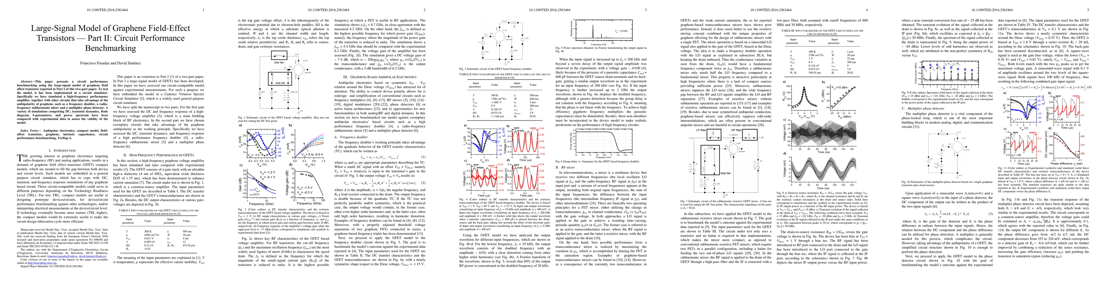 This paper benchmarks the circuit performance of graphene field-effect transistors using a large-signal model implemented in a simulator. Various circuits, including amplifiers, frequency doublers, and mixers, were tested and compared with experimental data to validate the model's accuracy.