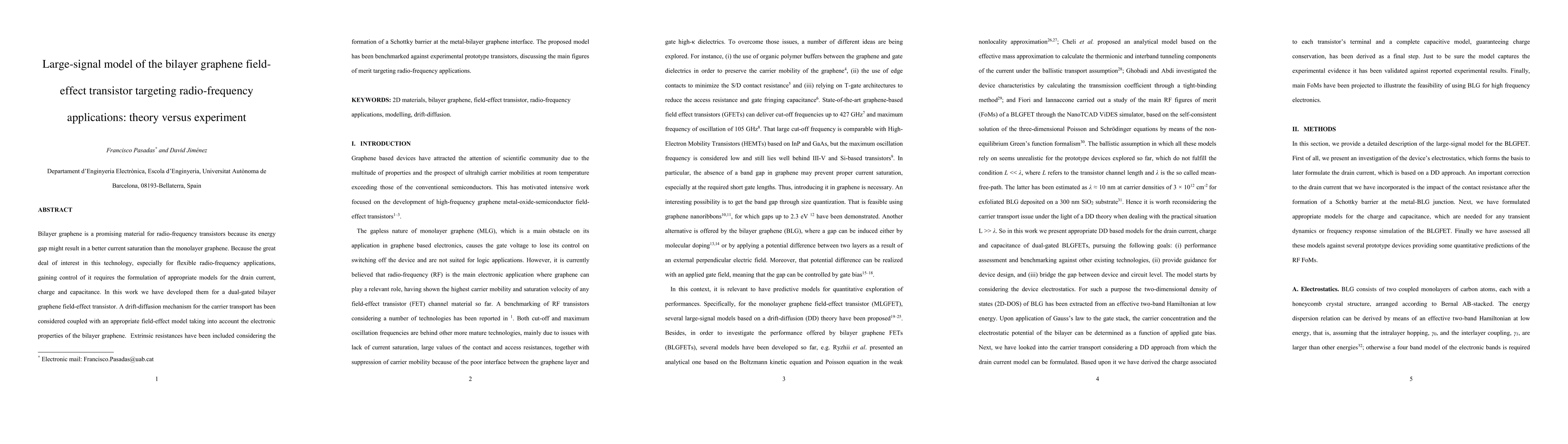This research develops a large-signal model for dual-gated bilayer graphene field-effect transistors, focusing on radio-frequency applications. The model integrates drift-diffusion carrier transport and field-effect mechanisms specific to bilayer graphene, incorporating Schottky barrier effects and extrinsic resistances. It is validated against experimental prototypes to evaluate performance metrics for radio-frequency use.
