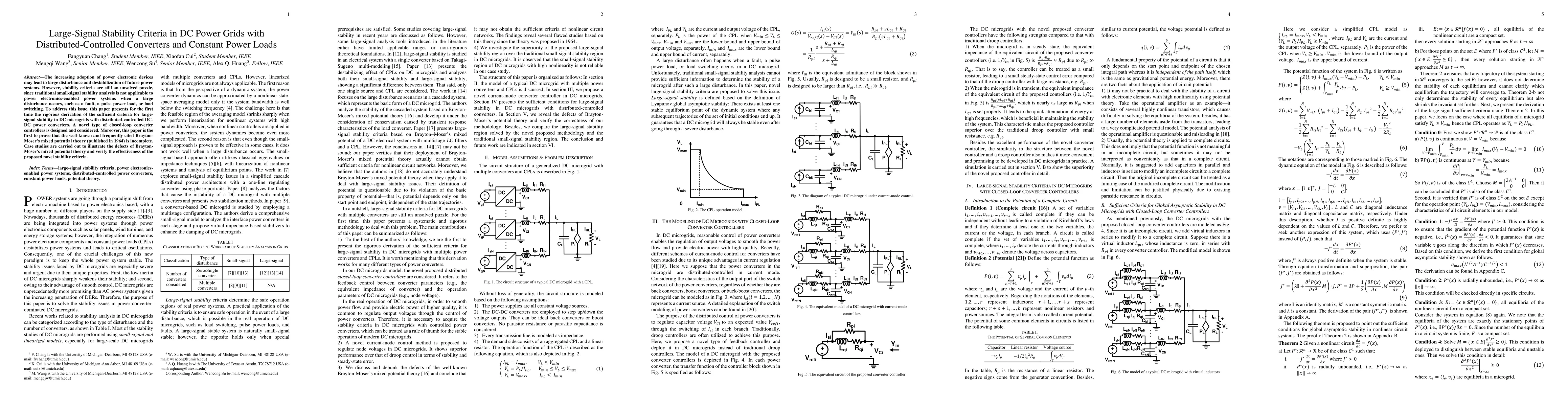 This paper presents new large-signal stability criteria for DC microgrids with distributed-controlled converters, addressing the limitations of traditional small-signal analysis. It also demonstrates the incompleteness of the Brayton-Moser mixed potential theory and validates the proposed criteria through case studies.