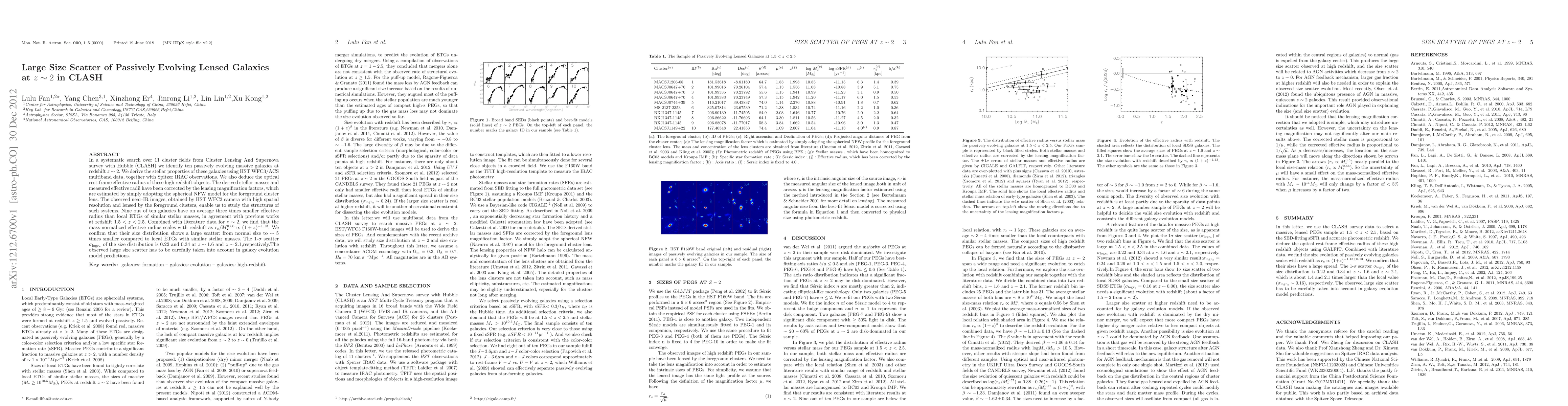 In a systematic search over 11 cluster fields from Cluster Lensing And Supernova survey with Hubble (CLASH) we identify ten passively evolving massive galaxies at redshift z~2.We derive the stellar properties of these galaxies using HST WFC3/ACS multiband data, together with Spitzer IRAC observations. We also deduce the optical rest-frame effective radius of these high redshift objects. The derived stellar masses and measured effective radii have been corrected by the lensing magnification factors, which are estimated by simply adopting the spherical NFW model for the foreground cluster lens. The observed near-IR images, obtained by HST WFC3 camera with high spatial resolution and lensed by the foreground clusters, enable us to study the structures of such systems. Nine out of ten galaxies have on average three times smaller effective radius than local ETGs of similar stellar masses, in agreement with previous works at redshift 1.5 < z < 2.5. Combined with literature data for z~2, we find that the mass-normalized effective radius scales with redshift as re/M^0.56 \propto (1 + z)^{-1.13}. We confirm that their size distribution shows a large scatter: from normal size to ~5 times smaller compared to local ETGs with similar stellar masses. The 1-{\sigma} scatter {\sigma}_{logre} of the size distribution is 0.22 and 0.34 at z~1.6 and z~2.1,respectively.The observed large size scatter has to be carefully taken into account in galaxy evolution model predictions.