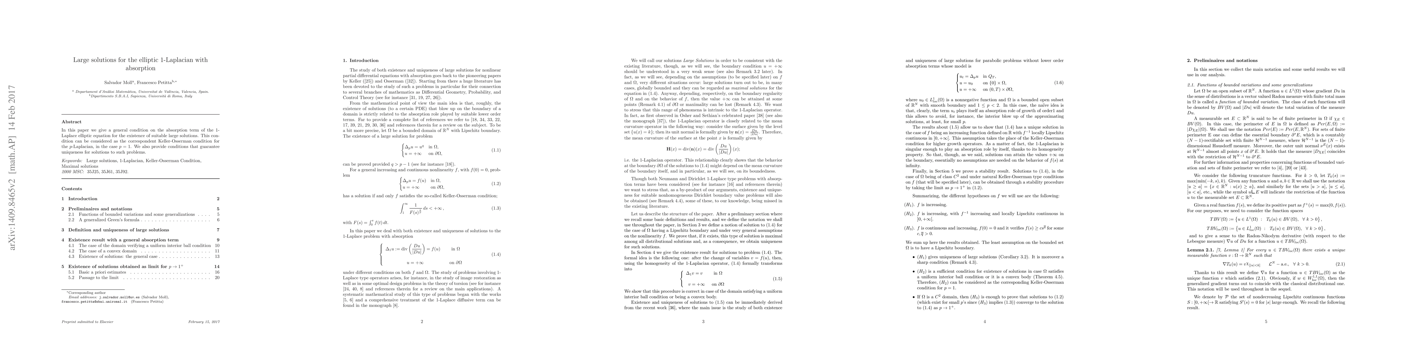 In this paper we give a general condition on the absorption term of the 1-Laplace elliptic equation for the existence of suitable large solutions. This condition can be considered as the correspondent Keller-Osserman condition for the $p$-Laplacian, in the case $p=1$. We also provide conditions that guarantee uniqueness for solutions to such problems.