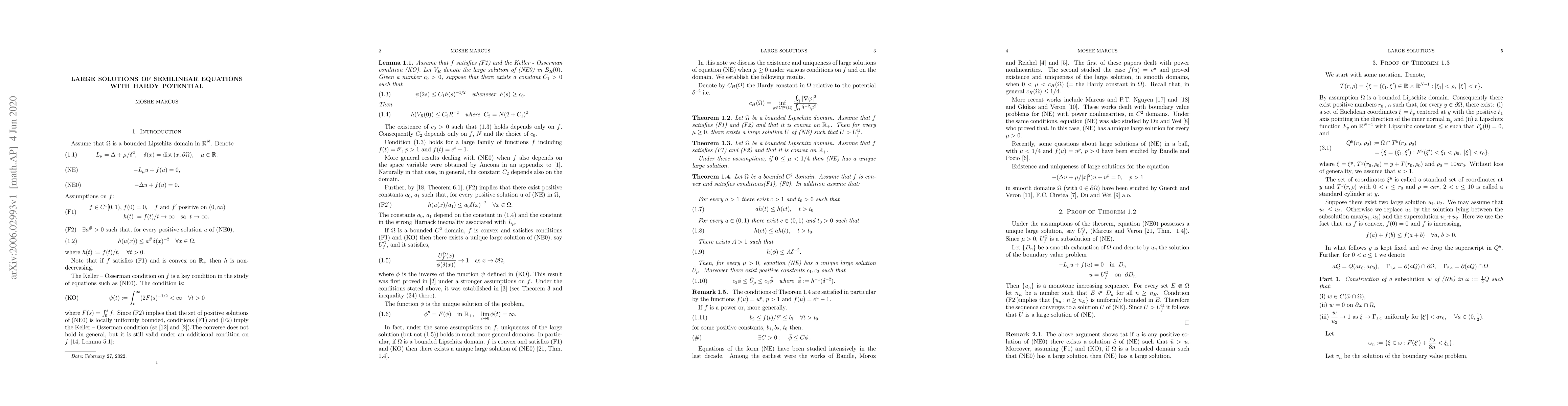 This paper investigates large solutions to semilinear equations with a Hardy potential, focusing on existence and uniqueness of solutions when the nonlinear term satisfies specific conditions.