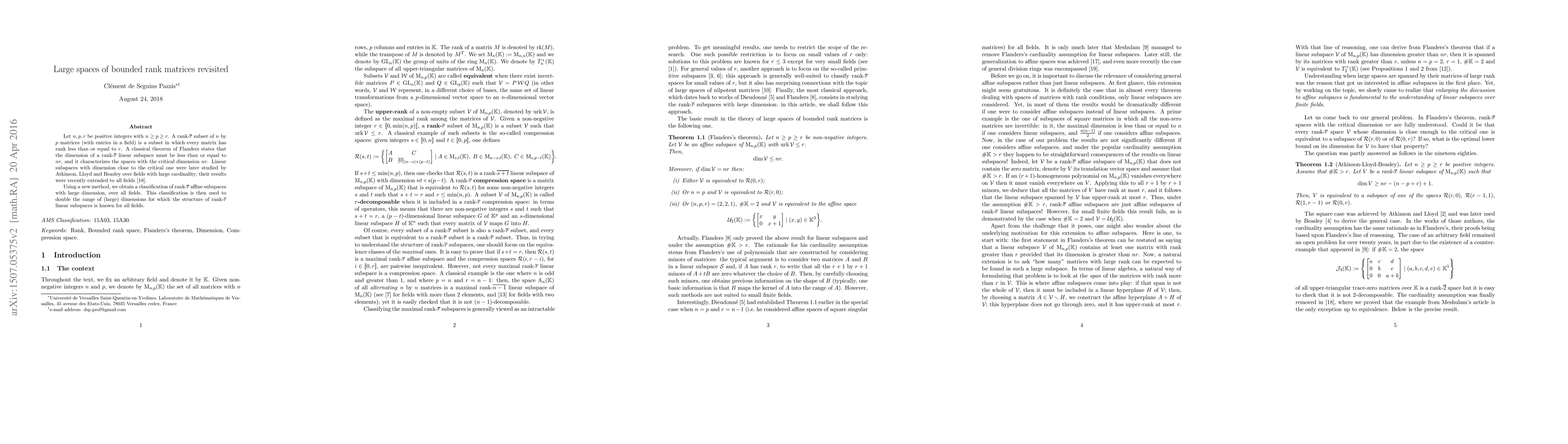 Let $n,p,r$ be positive integers with $n \geq p\geq r$. A rank-$\overline{r}$ subset of $n$ by $p$ matrices (with entries in a field) is a subset in which every matrix has rank less than or equal to $r$. A classical theorem of Flanders states that the dimension of a rank-$\overline{r}$ linear subspace must be less than or equal to $nr$, and it characterizes the spaces with the critical dimension $nr$. Linear subspaces with dimension close to the critical one were later studied by Atkinson, Lloyd and Beasley over fields with large cardinality; their results were recently extended to all fields. Using a new method, we obtain a classification of rank-$\overline{r}$ affine subspaces with large dimension, over all fields. This classification is then used to double the range of (large) dimensions for which the structure of rank $\overline{r}$-linear subspaces is known for all fields.