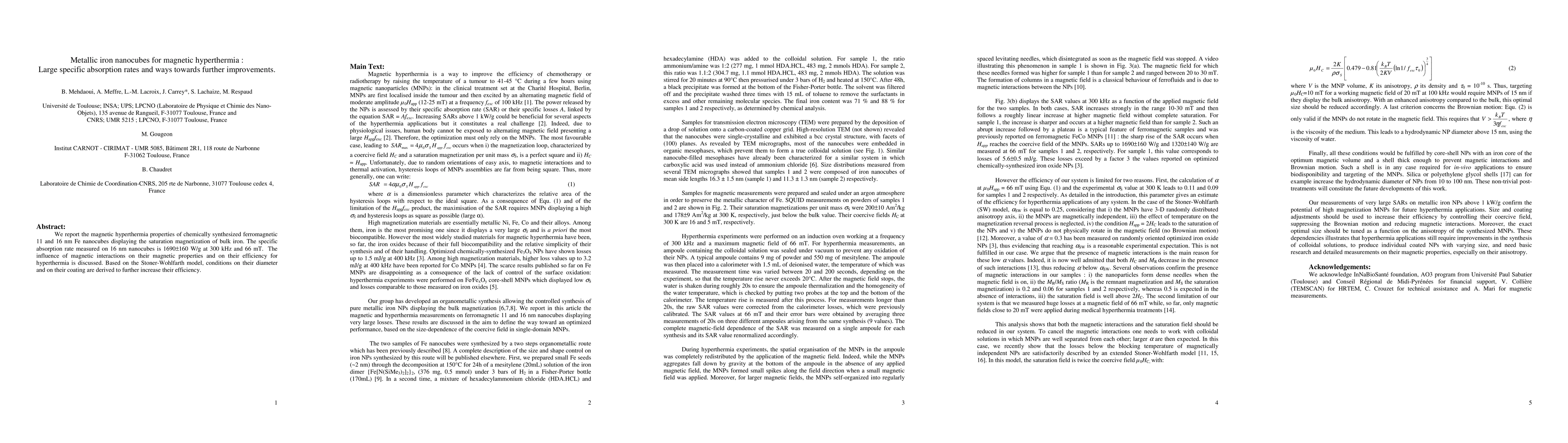 This paper investigates the magnetic hyperthermia properties of 11 and 16 nm cubic iron nanoparticles, finding that 16 nm nanocubes exhibit a high specific absorption rate of 1690±160 W/g. Although the nanoparticles show promising heating capabilities, they are not fully optimized due to magnetic interactions, suggesting potential for enhanced performance with further optimization and oxidation protection for biomedical applications.
