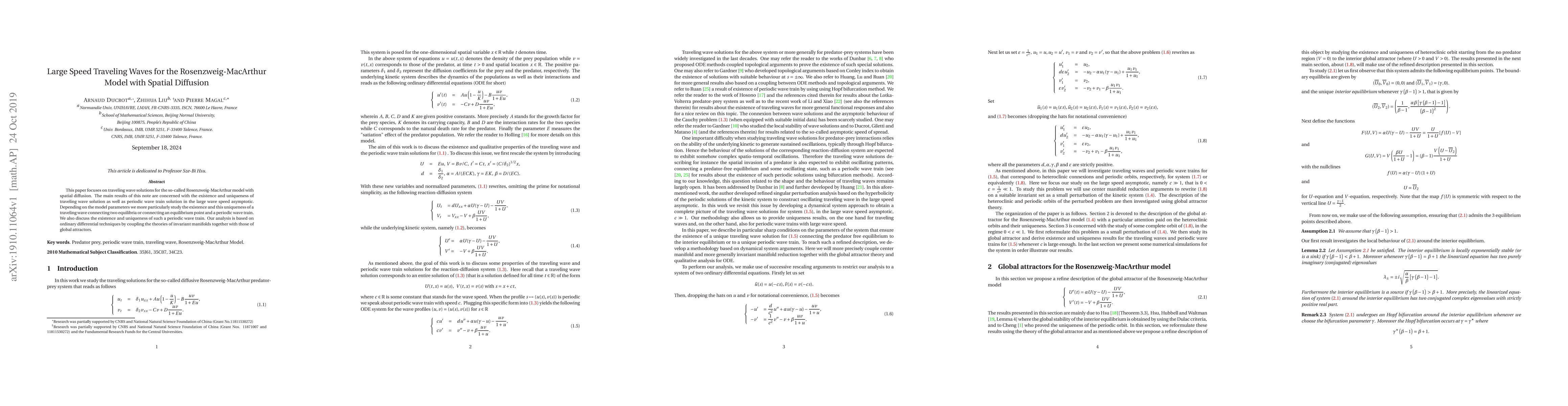 This paper investigates traveling wave solutions for the Rosenzweig-MacArthur model with spatial diffusion, focusing on the existence and uniqueness of large speed traveling waves and periodic wave trains. The study employs ordinary differential techniques and combines invariant manifolds with global attractors theory.