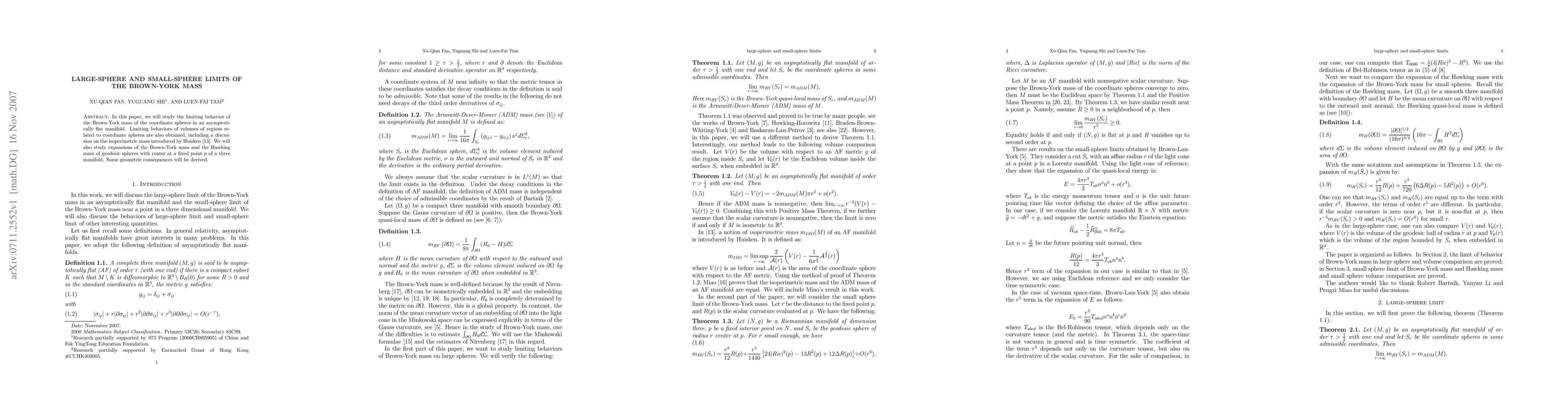This paper investigates the limiting behaviors of the Brown-York mass for coordinate spheres in asymptotically flat manifolds, comparing large-sphere and small-sphere limits. It also explores expansions of the Brown-York mass and Hawking mass for geodesic spheres and discusses geometric consequences.