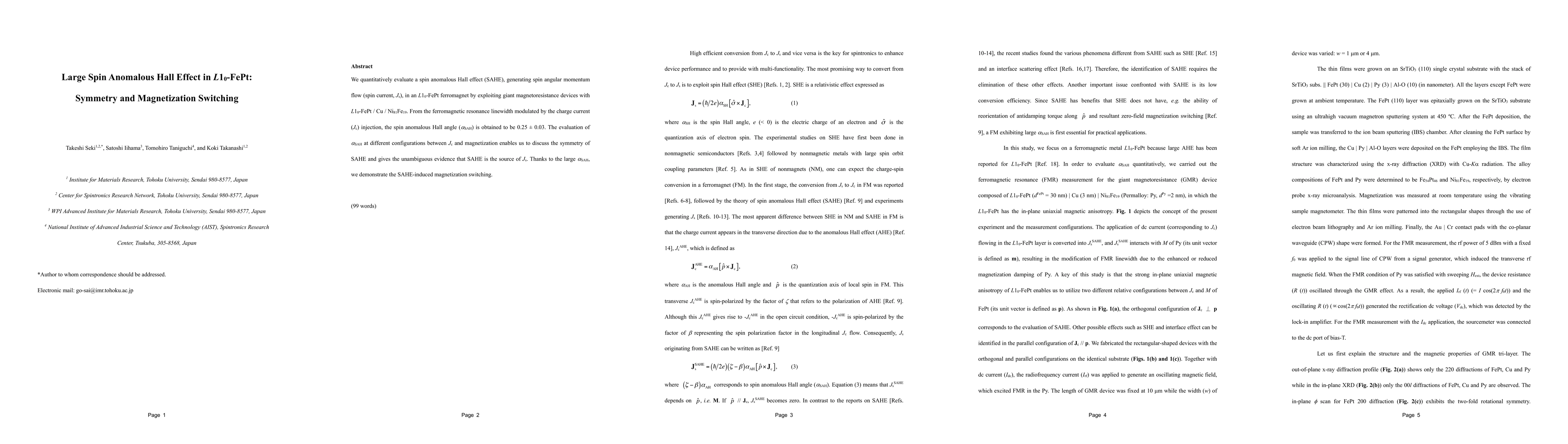 This paper evaluates a large spin anomalous Hall effect (SAHE) in L1$\rm_{0}$-FePt ferromagnets, finding a spin anomalous Hall angle of 0.25 $ \pm $ 0.03. The study demonstrates SAHE-induced magnetization switching, providing evidence of SAHE as a source of spin current.