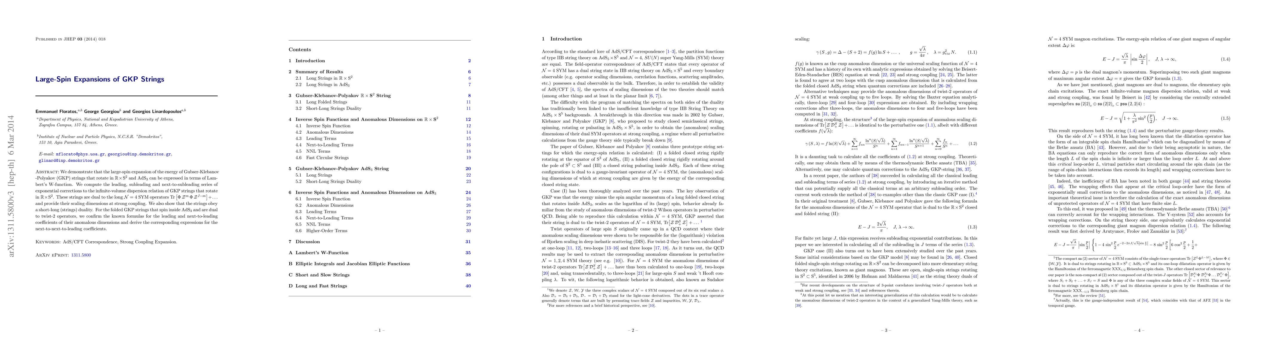 We demonstrate that the large-spin expansion of the energy of Gubser-Klebanov-Polyakov (GKP) strings that rotate in RxS2 and AdS3 can be expressed in terms of Lambert's W-function. We compute the leading, subleading and next-to-subleading series of exponential corrections to the infinite-volume dispersion relation of GKP strings that rotate in RxS2. These strings are dual to certain long operators of N=4 SYM theory and provide their scaling dimensions at strong coupling. We also show that the strings obey a short-long (strings) duality. For the folded GKP strings that spin inside AdS3 and are dual to twist-2 operators, we confirm the known formulas for the leading and next-to-leading coefficients of their anomalous dimensions and derive the corresponding expressions for the next-to-next-to-leading coefficients.