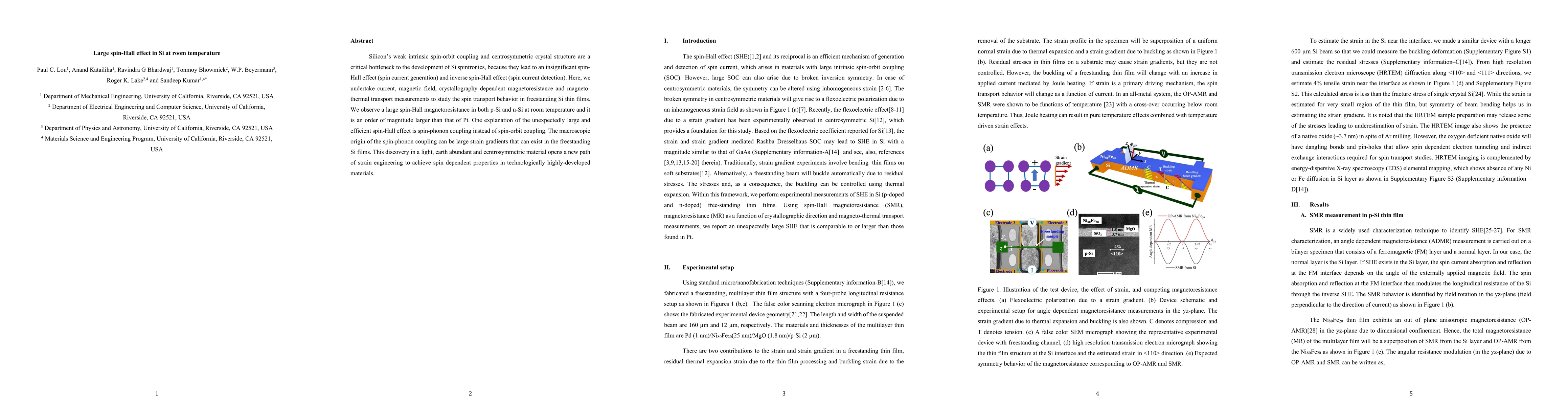 This study reveals a significant spin-Hall effect in silicon at room temperature, an order of magnitude larger than in platinum, due to spin-phonon coupling rather than spin-orbit coupling, potentially enabled by large strain gradients in freestanding silicon films. This breakthrough suggests a new strain engineering approach to achieve spintronic properties in silicon.