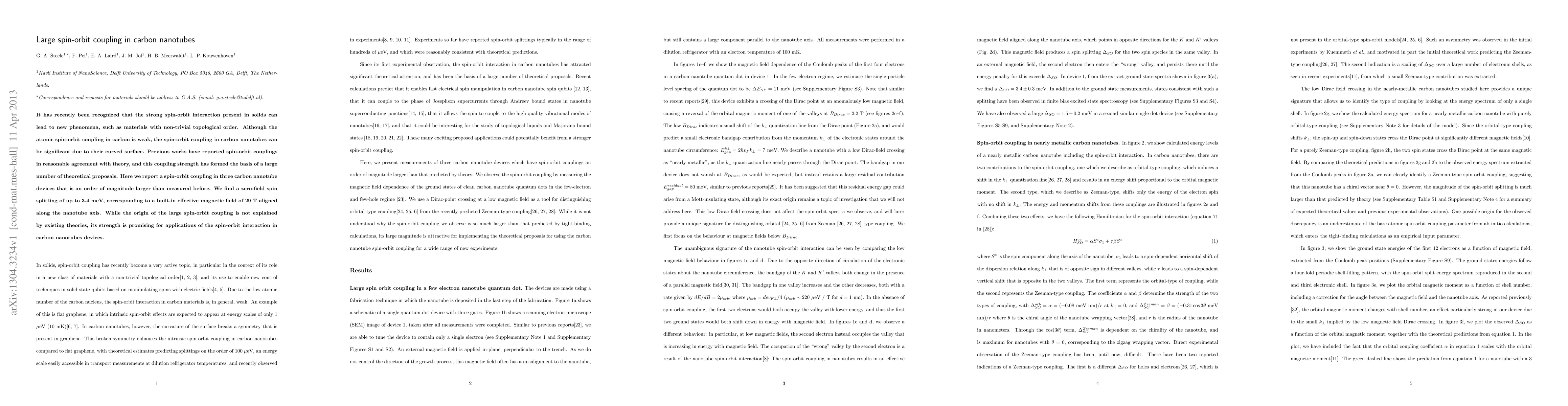 This paper reports a spin-orbit coupling in carbon nanotube devices that is an order of magnitude larger than previously measured, demonstrating a zero-field spin splitting of up to 3.4 meV, equivalent to an effective magnetic field of 29 T along the nanotube axis. The large coupling suggests promising applications but its origin remains unexplained by existing theories.