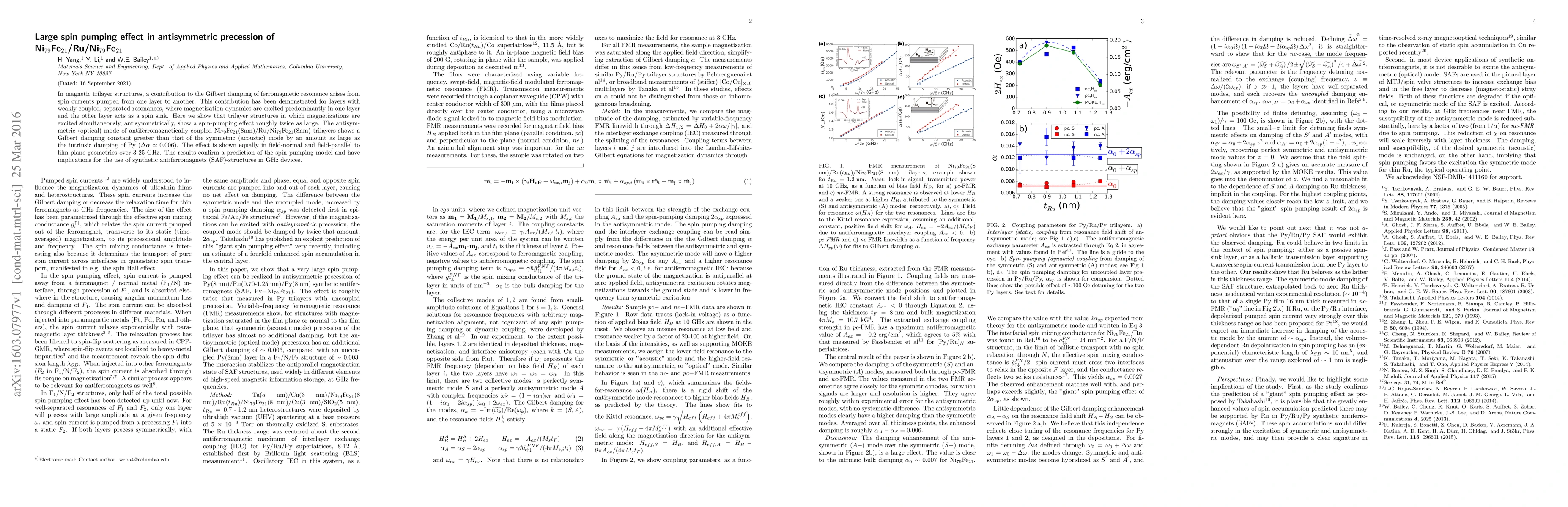 In magnetic trilayer structures, a contribution to the Gilbert damping of ferromagnetic resonance arises from spin currents pumped from one layer to another. This contribution has been demonstrated for layers with weakly coupled, separated resonances, where magnetization dynamics are excited predominantly in one layer and the other layer acts as a spin sink. Here we show that trilayer structures in which magnetizations are excited simultaneously, antisymmetrically, show a spin-pumping effect roughly twice as large. The antisymmetric (optical) mode of antiferromagnetically coupled Ni$_{79}$Fe$_{21}$(8nm)/Ru/Ni$_{79}$Fe$_{21}$(8nm) trilayers shows a Gilbert damping constant greater than that of the symmetric (acoustic) mode by an amount as large as the intrinsic damping of Py ($\Delta \alpha\simeq\textrm{0.006}$). The effect is shown equally in field-normal and field-parallel to film plane geometries over 3-25 GHz. The results confirm a prediction of the spin pumping model and have implications for the use of synthetic antiferromagnets (SAF)-structures in GHz devices.
