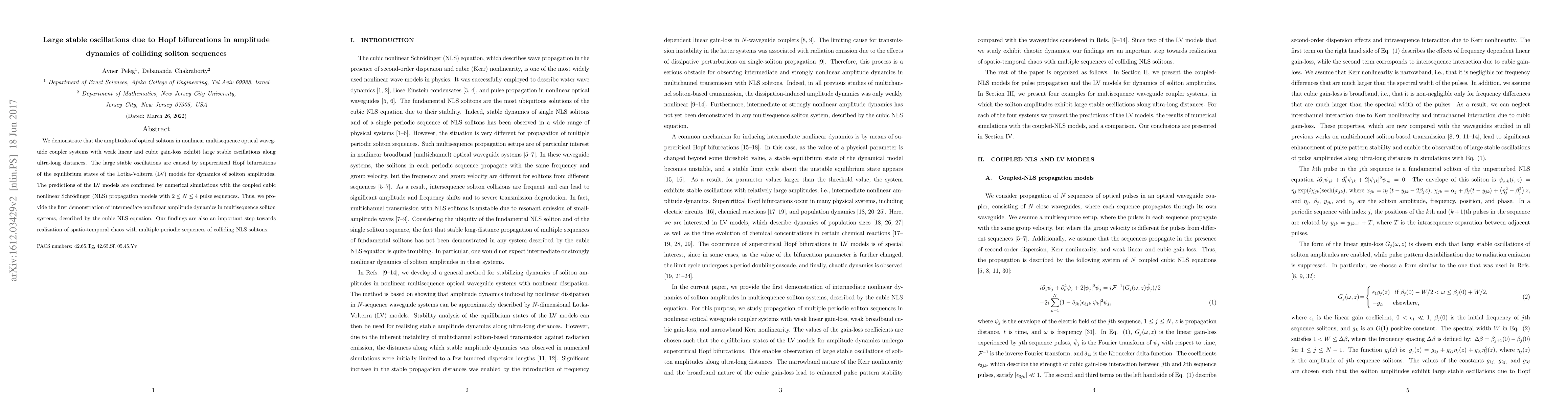 We demonstrate that the amplitudes of optical solitons in nonlinear multisequence optical waveguide coupler systems with weak linear and cubic gain-loss exhibit large stable oscillations along ultra-long distances. The large stable oscillations are caused by supercritical Hopf bifurcations of the equilibrium states of the Lotka-Volterra (LV) models for dynamics of soliton amplitudes. The predictions of the LV models are confirmed by numerical simulations with the coupled cubic nonlinear Schr\"odinger (NLS) propagation models with $2 \le N \le 4$ pulse sequences. Thus, we provide the first demonstration of intermediate nonlinear amplitude dynamics in multisequence soliton systems, described by the cubic NLS equation. Our findings are also an important step towards realization of spatio-temporal chaos with multiple periodic sequences of colliding NLS solitons.