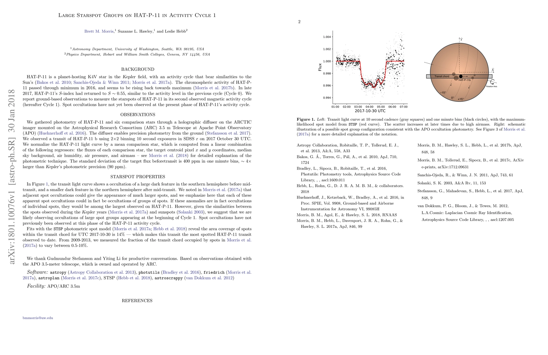 HAT-P-11 is a planet-hosting K4V star in the Kepler field, with an activity cycle that bear similarities to the Sun's. The chromospheric activity of HAT-P-11 indicates that a new activity cycle is beginning. We report ground-based observations with holographic diffuser photometry to measure the starspots of HAT-P-11 in its second observed magnetic activity cycle (Cycle 1). We find the area coverage of starspots within the transit chord for UTC 2017-10-30 is 14% --- which makes this transit the most spotted HAT-P-11 transit observed to date. We suggest that we are likely observing occultations of large spot groups appearing at the beginning of Cycle 1.