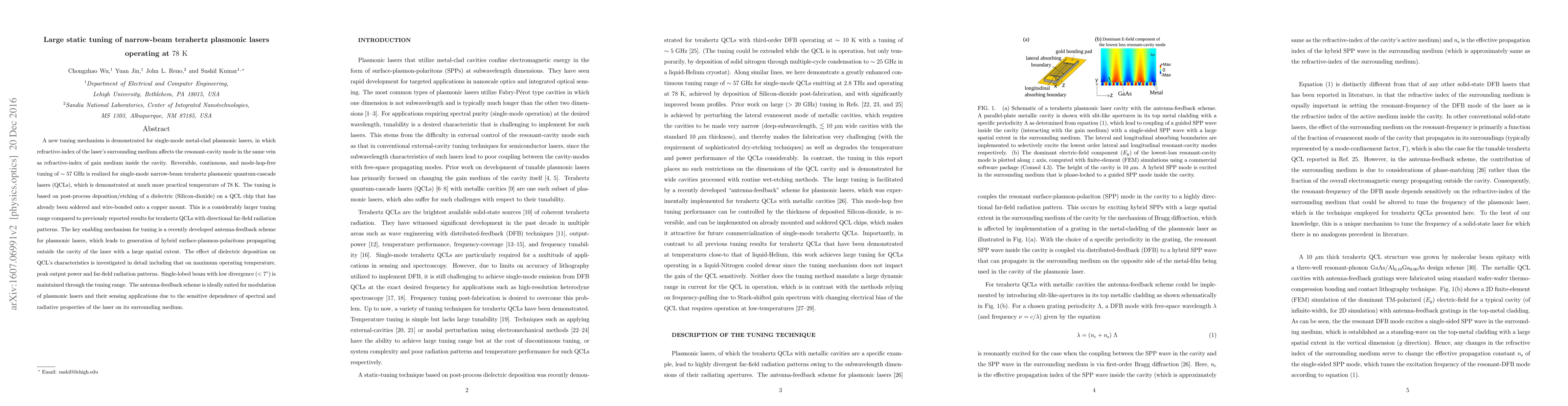 This paper presents a novel tuning mechanism for single-mode terahertz plasmonic quantum-cascade lasers, achieving a large static tuning range of ~57GHz through dielectric deposition at 78K. The method employs an antenna-feedback scheme, maintaining a single-lobed beam with low divergence and enabling potential sensing applications.