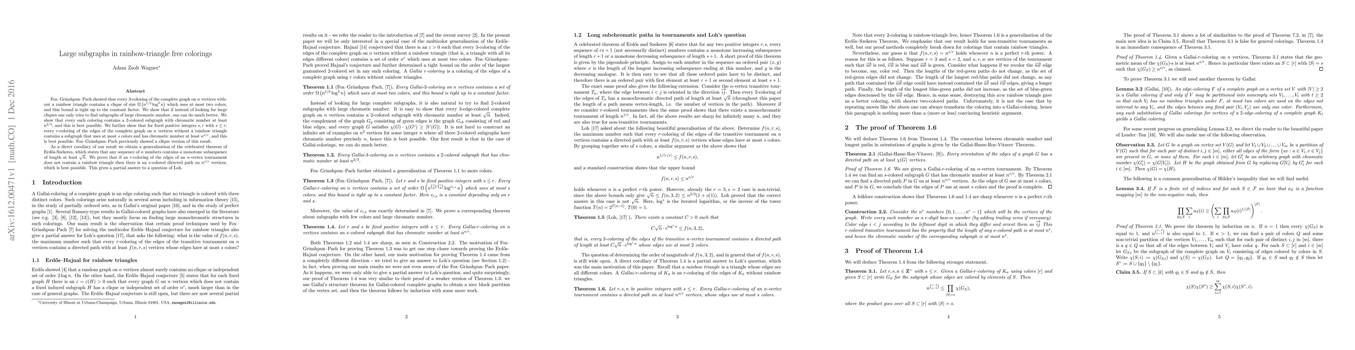 Researchers showed that certain colorings of a complete graph without rainbow triangles contain much larger subgraphs with high chromatic numbers, improving upon previous results in both clique and edge cases.