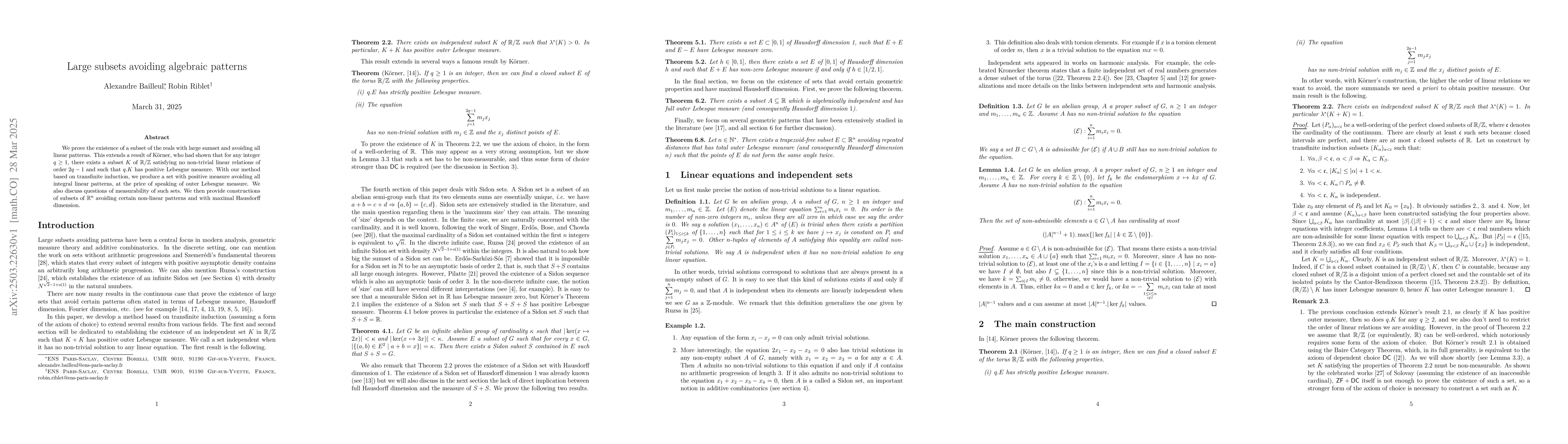 This research extends previous findings by Körner, providing a more comprehensive understanding of subsets avoiding linear patterns and contributing to measure theory in real numbers.