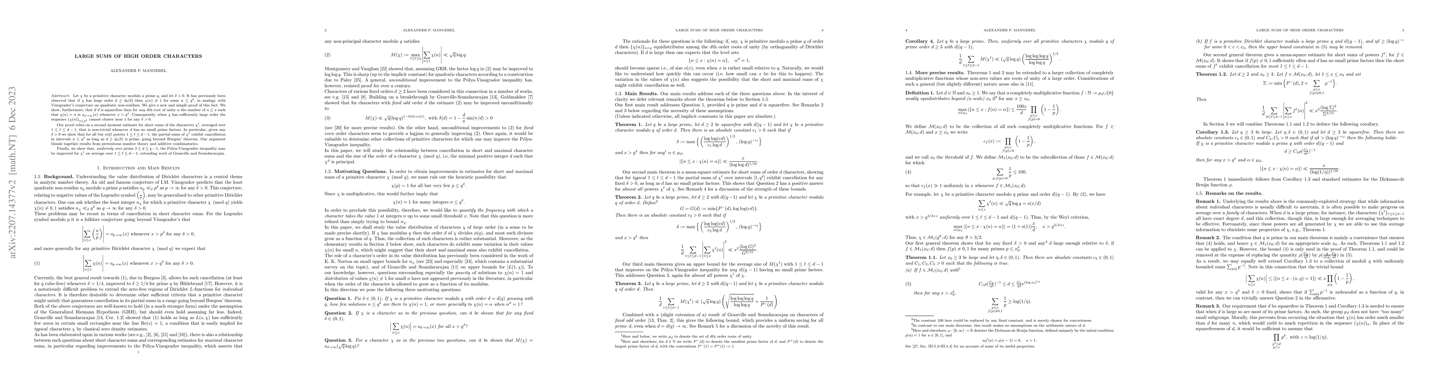 Let $\chi$ be a primitive character modulo a prime $q$, and let $\delta > 0$. It has previously been observed that if $\chi$ has large order $d \geq d_0(\delta)$ then $\chi(n) \neq 1$ for some $n \leq q^{\delta}$, in analogy with Vinogradov's conjecture on quadratic non-residues. We give a new and simple proof of this fact. We show, furthermore, that if $d$ is squarefree then for any $d$th root of unity $\alpha$ the number of $n \leq x$ such that $\chi(n) = \alpha$ is $o_{d \to \infty}(x)$ whenever $x > q^\delta$. Consequently, when $\chi$ has sufficiently large order the sequence $(\chi(n))_{n \leq q^\delta}$ cannot cluster near $1$ for any $\delta > 0$. Our proof relies on a second moment estimate for short sums of the characters $\chi^\ell$, averaged over $1 \leq \ell \leq d-1$, that is non-trivial whenever $d$ has no small prime factors. In particular, given any $\delta > 0$ we show that for all but $o(d)$ powers $1 \leq \ell \leq d-1$, the partial sums of $\chi^\ell$ exhibit cancellation in intervals $n \leq q^\delta$ as long as $d \geq d_0(\delta)$ is prime, going beyond Burgess' theorem. Our argument blends together results from pretentious number theory and additive combinatorics. Finally, we show that, uniformly over prime $3 \leq d \leq q-1$, the P\'{o}lya-Vinogradov inequality may be improved for $\chi^\ell$ on average over $1 \leq \ell \leq d-1$, extending work of Granville and Soundararajan.