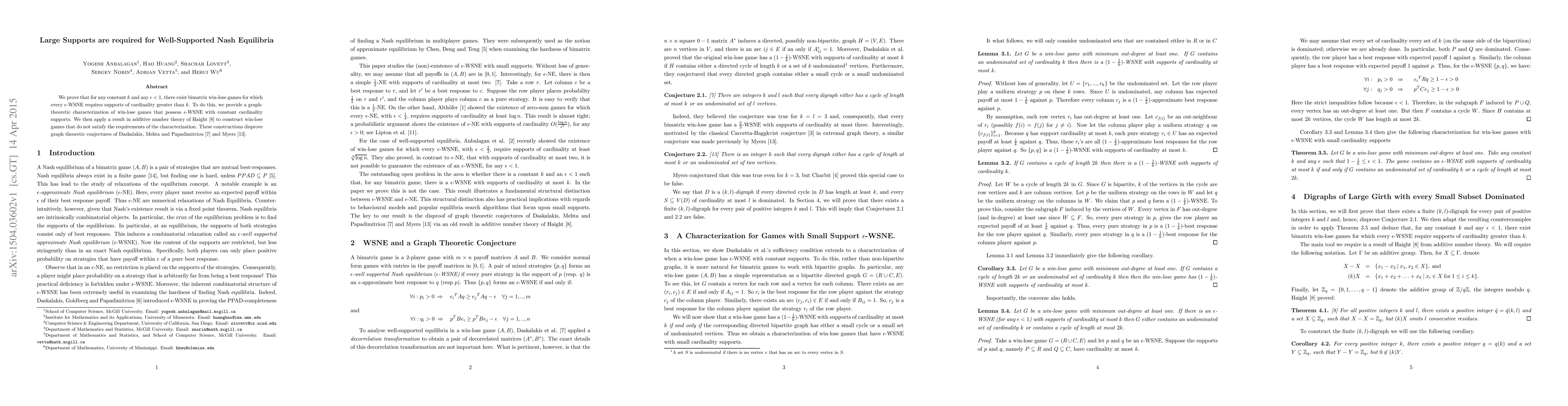 We prove that for any constant $k$ and any $\epsilon<1$, there exist bimatrix win-lose games for which every $\epsilon$-WSNE requires supports of cardinality greater than $k$. To do this, we provide a graph-theoretic characterization of win-lose games that possess $\epsilon$-WSNE with constant cardinality supports. We then apply a result in additive number theory of Haight to construct win-lose games that do not satisfy the requirements of the characterization. These constructions disprove graph theoretic conjectures of Daskalakis, Mehta and Papadimitriou, and Myers.