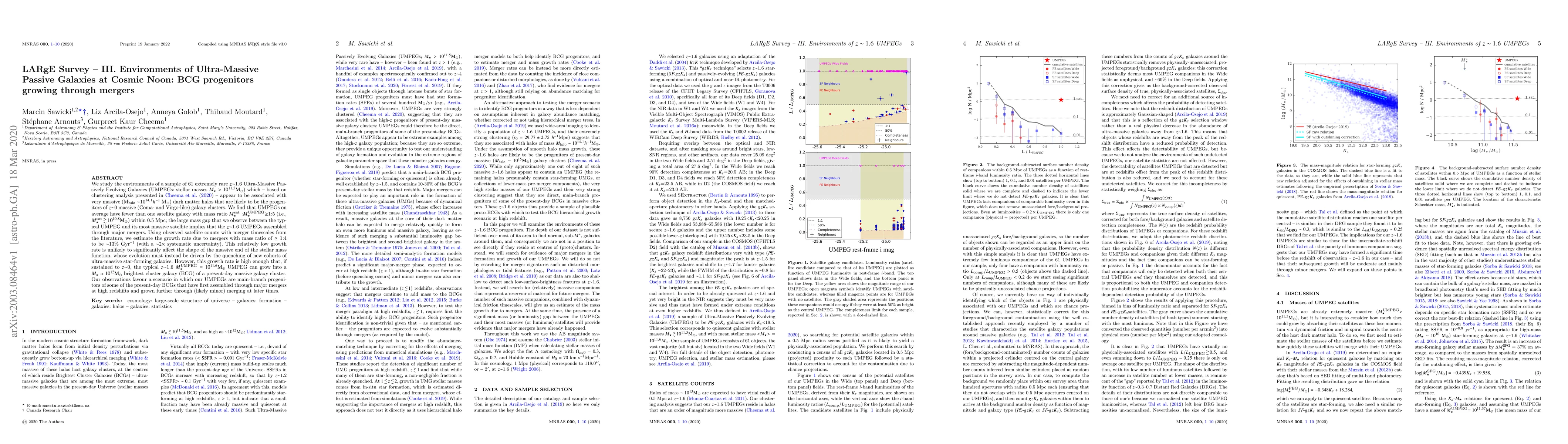 The LARgE Survey investigates the environments of ultra-massive passive galaxies at cosmic noon, finding they have few satellite galaxies and likely grew through major mergers. This growth rate, though significant, is insufficient to alter the massive end of the stellar mass function, suggesting the evolution is driven by quenching of new ultra-massive star-forming galaxies.