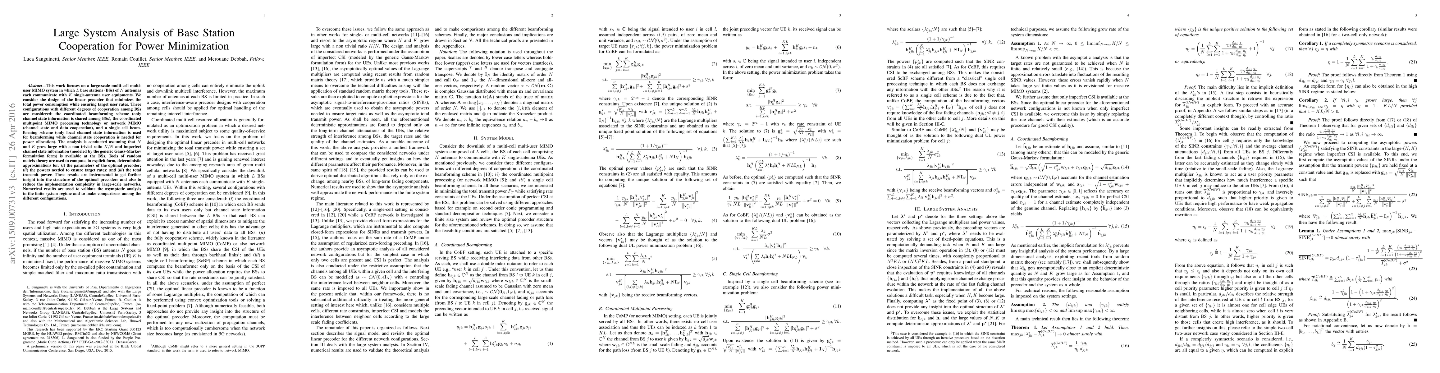 This work focuses on a large-scale multi-cell multi-user MIMO system in which $L$ base stations (BSs) of $N$ antennas each communicate with $K$ single-antenna user equipments. We consider the design of the linear precoder that minimizes the total power consumption while ensuring target user rates. Three configurations with different degrees of cooperation among BSs are considered: the coordinated beamforming scheme (only channel state information is shared among BSs), the coordinated multipoint MIMO processing technology or network MIMO (channel state and data cooperation), and a single cell beamforming scheme (only local channel state information is used for beamforming while channel state cooperation is needed for power allocation). The analysis is conducted assuming that $N$ and $K$ grow large with a non trivial ratio $K/N$ and imperfect channel state information (modeled by the generic Gauss-Markov formulation form) is available at the BSs. Tools of random matrix theory are used to compute, in explicit form, deterministic approximations for: (i) the parameters of the optimal precoder; (ii) the powers needed to ensure target rates; and (iii) the total transmit power. These results are instrumental to get further insight into the structure of the optimal precoders and also to reduce the implementation complexity in large-scale networks. Numerical results are used to validate the asymptotic analysis in the finite system regime and to make comparisons among the different configurations.