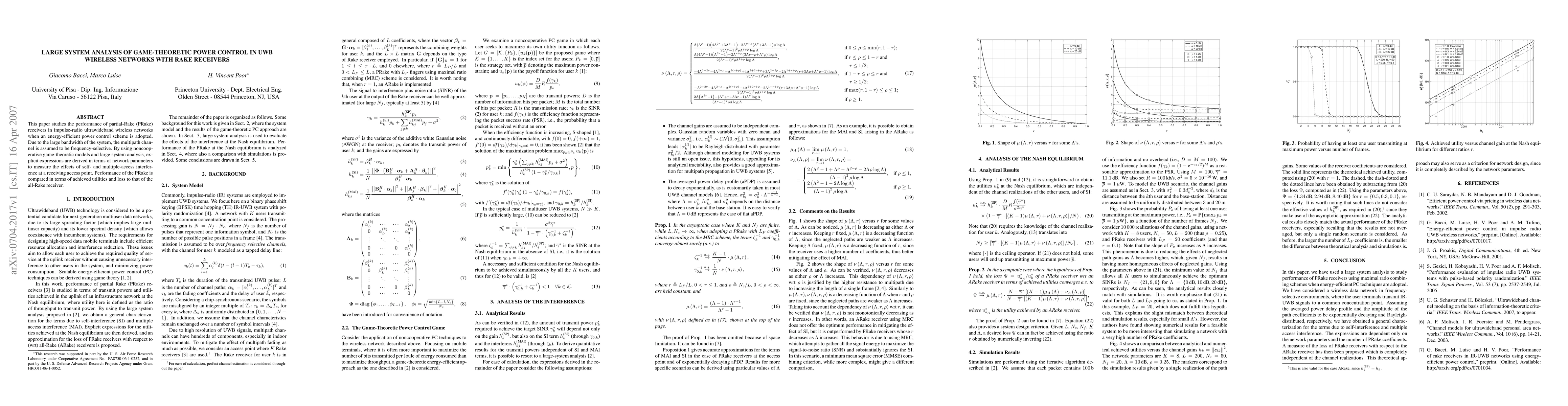 This paper analyzes the performance of partial-Rake receivers in ultrawideband networks using game-theoretic power control, deriving expressions for interference effects. The study compares the achieved utilities and loss of partial-Rake receivers against all-Rake receivers.