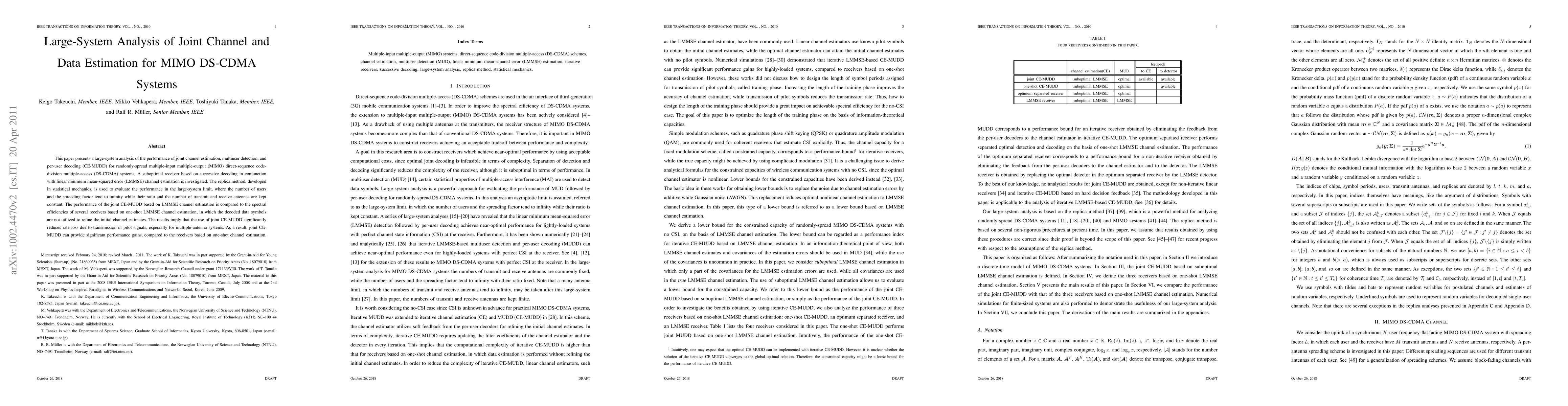This paper analyzes the performance of joint channel estimation, multiuser detection, and decoding (CE-MUDD) in large MIMO DS-CDMA systems using the replica method. It finds that CE-MUDD with LMMSE channel estimation significantly reduces rate loss compared to one-shot LMMSE, especially benefiting multiple-antenna systems.