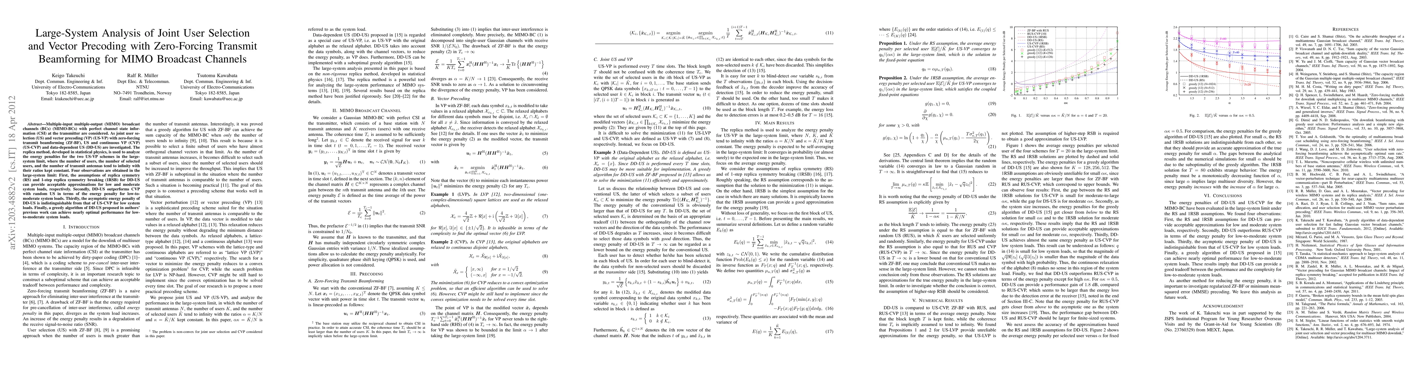 This paper analyzes large-system MIMO broadcast channels using joint user selection and vector precoding with zero-forcing beamforming. The replica method reveals that data-dependent user selection outperforms continuous vector precoding for low-to-moderate system loads, while maintaining near-optimal performance.