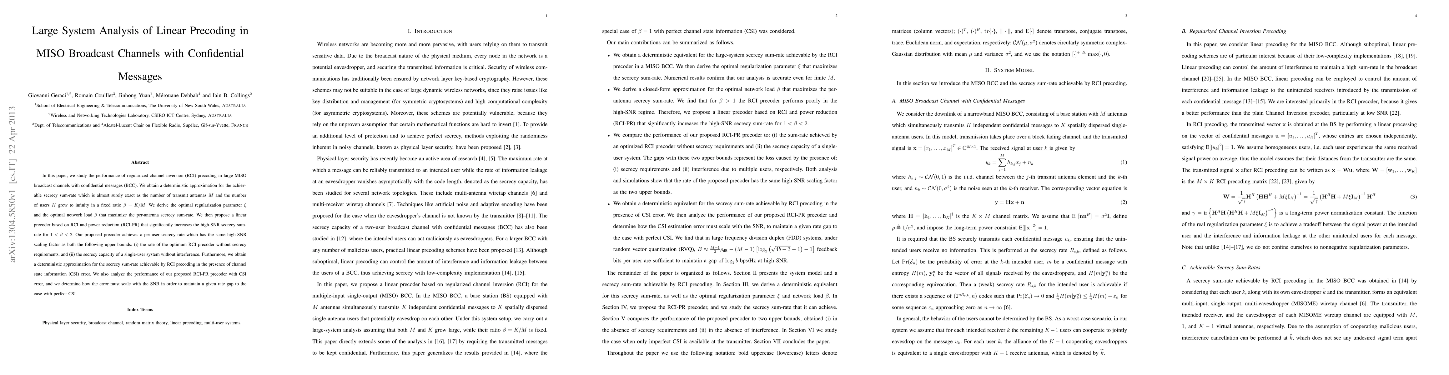 This paper investigates the performance of regularized channel inversion precoding in large MISO broadcast channels with confidential messages, deriving optimal parameters for maximizing secrecy sum-rate. It proposes a linear precoder that enhances high-SNR secrecy performance and analyzes its behavior under channel state information errors.