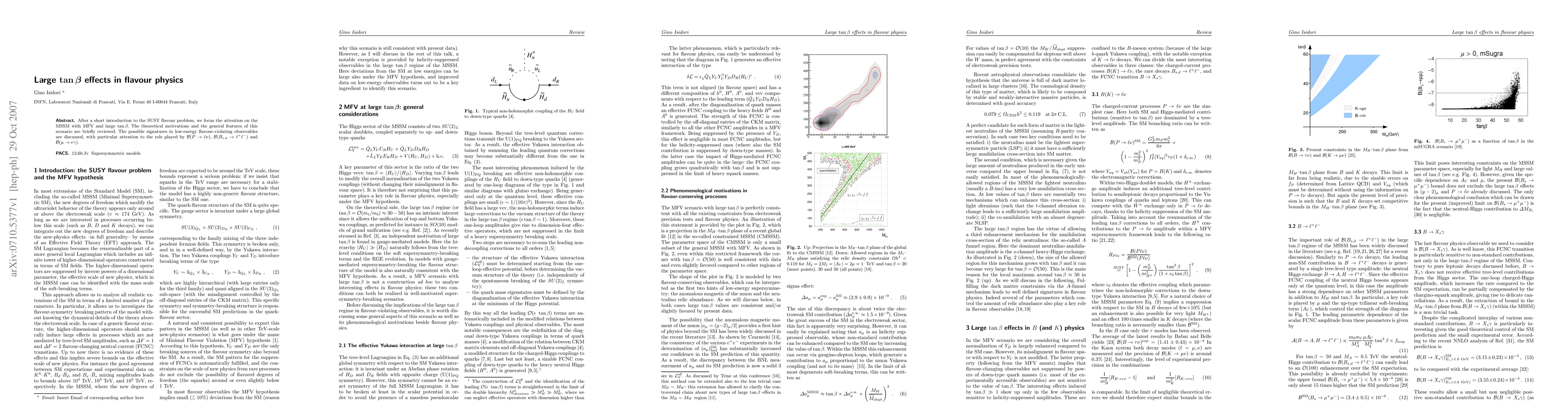 After a short introduction to the SUSY flavour problem, we focus the attention on the MSSM with MFV and large $\tan\beta$. The theoretical motivations and the general features of this scenario are briefly reviewed. The possible signatures in low-energy flavour-violating observables are discussed, with particular attention to the role played by $\BR(P\to\ell\nu)$, $\BR(B_{s,d}\to \ell^+\ell^-)$ and $\BR(\mu\to e \gamma)$