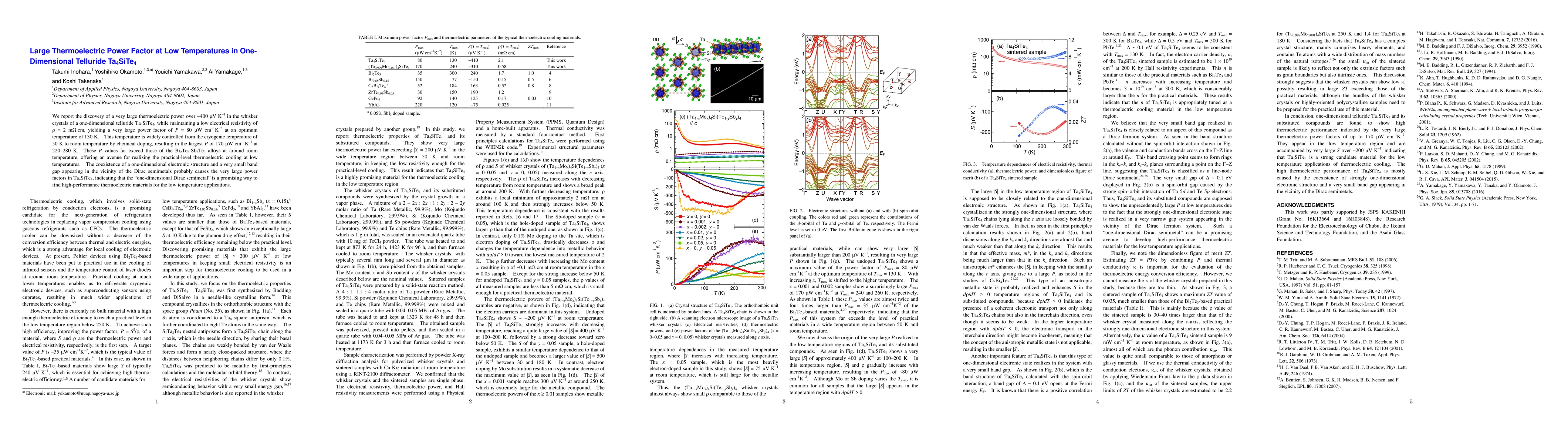 This paper reports the discovery of a one-dimensional telluride, Ta4SiTe4, exhibiting a large thermoelectric power factor of up to 170 microW cm-1 K-2 at temperatures between 220-280 K, significantly surpassing conventional materials like Bi2Te3-Sb2Te3 alloys. The material's unique one-dimensional electronic structure and small band gap contribute to its exceptional thermoelectric performance.