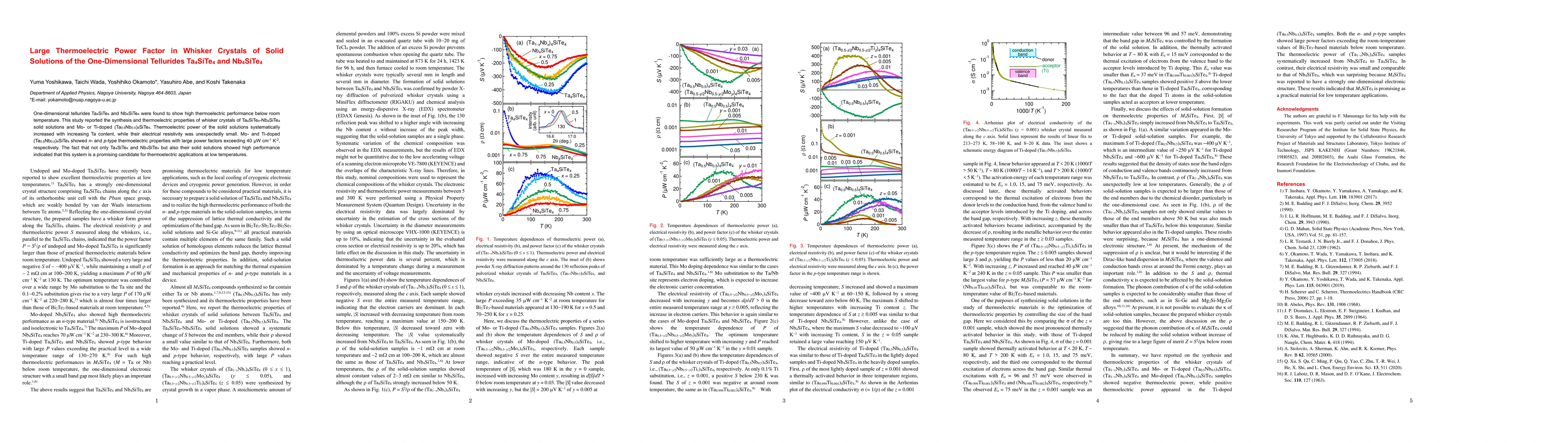 One-dimensional tellurides Ta4SiTe4 and Nb4SiTe4 were found to show high thermoelectric performance below room temperature. This study reported the synthesis and thermoelectric properties of whisker crystals of Ta4SiTe4-Nb4SiTe4 solid solutions and Mo- or Ti-doped (Ta0.5Nb0.5)4SiTe4. Thermoelectric power of the solid solutions systematically increased with increasing Ta content, while their electrical resistivity was unexpectedly small. Mo- and Ti-doped (Ta0.5Nb0.5)4SiTe4 showed n- and p-type thermoelectric properties with large power factors exceeding 40 microW cm-1 K-2, respectively. The fact that not only Ta4SiTe4 and Nb4SiTe4 but also their solid solutions showed high performance indicated that this system is a promising candidate for thermoelectric applications at low temperatures.