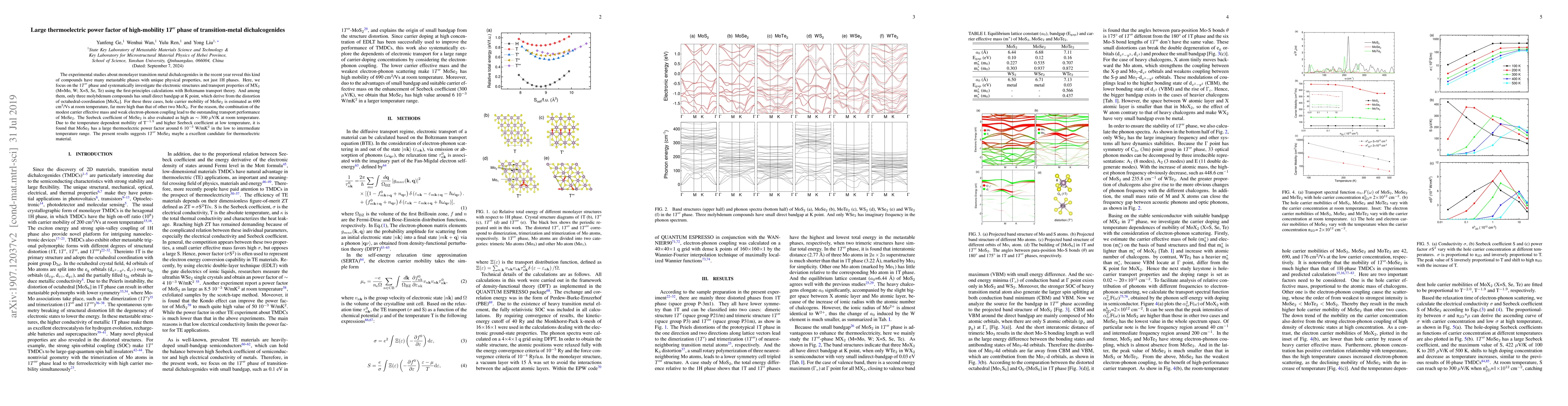 This paper investigates the 1T'' phase of transition metal dichalcogenides, finding that MoSe2 exhibits exceptional thermoelectric properties due to high hole mobility and a modest Seebeck coefficient. MoSe2 shows a large thermoelectric power factor of around 6 x 10^-3 W/mK^2 in low to intermediate temperatures, suggesting it as a promising thermoelectric material.