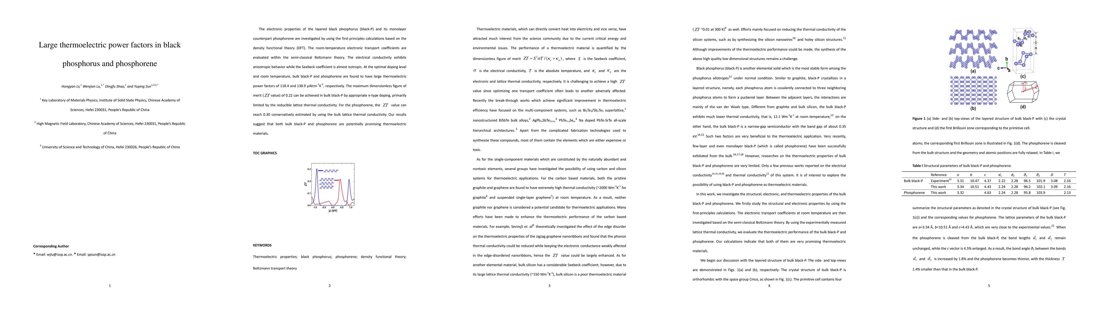 This study explores the thermoelectric properties of black phosphorus and phosphorene using first-principles calculations and finds both materials exhibit large thermoelectric power factors. Bulk black-P and phosphorene show potential with ZT values of 0.22 and 0.30, respectively, indicating their promise as thermoelectric materials.