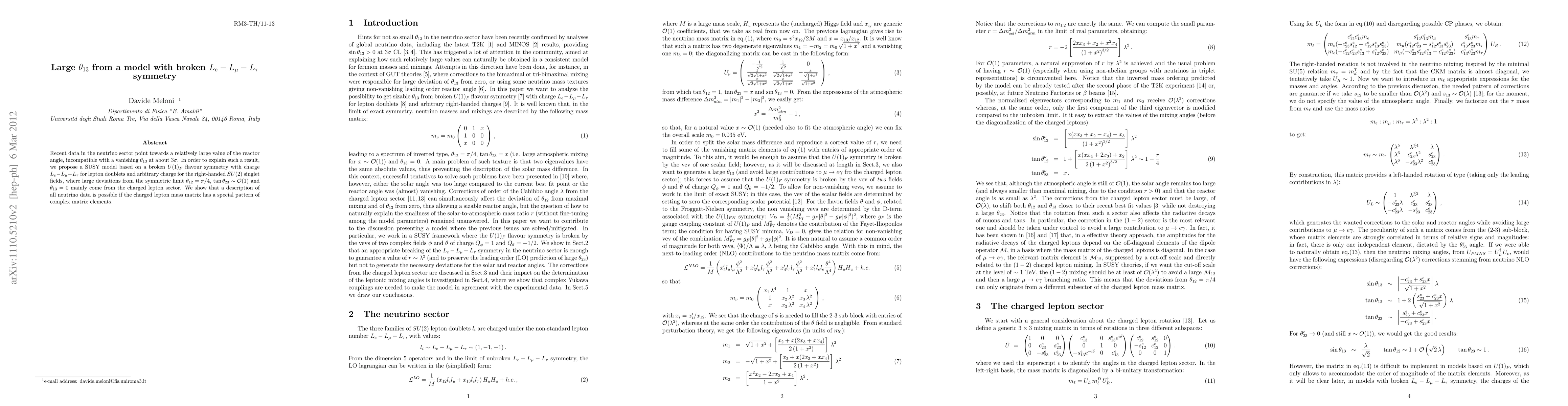 This paper proposes a SUSY model with broken L_e-L_mu-L_tau symmetry to explain a large neutrino mixing angle theta_13, suggesting that deviations from symmetric limits arise primarily from the charged lepton sector. The model accommodates all neutrino data through a specific pattern in the charged lepton mass matrix.