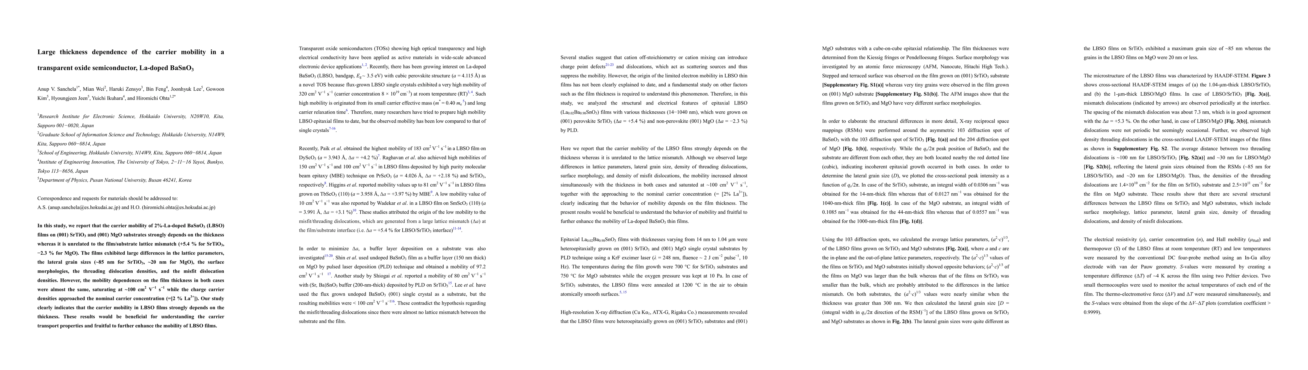 This study reveals that the carrier mobility in 2%-La-doped BaSnO3 films is significantly influenced by film thickness rather than lattice mismatch or substrate type. The mobility saturates at ~100 cm² V⁻¹ s⁻¹, suggesting a thickness-dependent mechanism for mobility enhancement in these transparent oxide semiconductors.