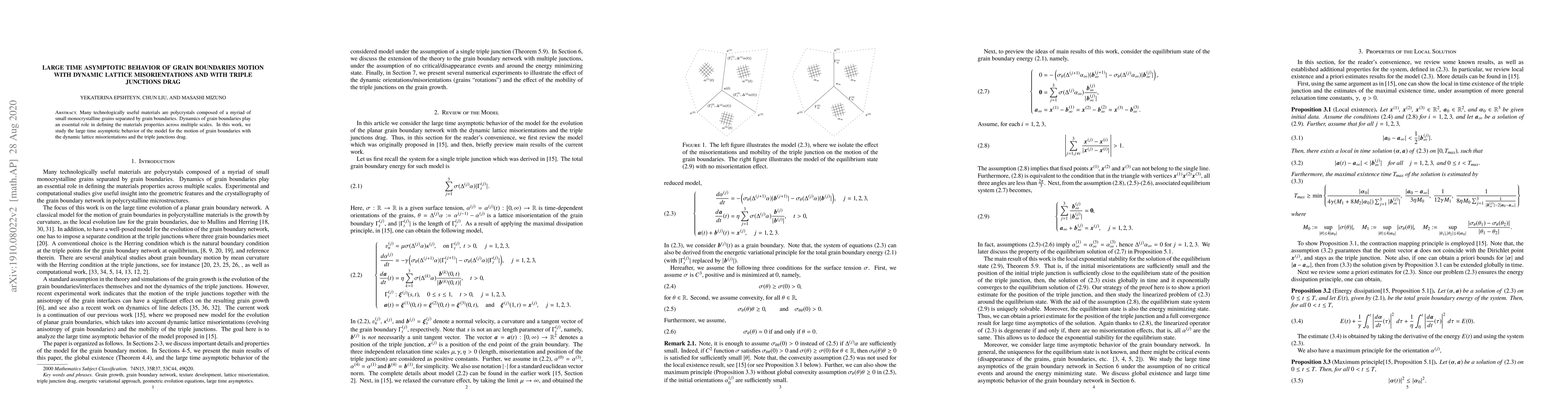 Many technologically useful materials are polycrystals composed of a myriad of small monocrystalline grains separated by grain boundaries. Dynamics of grain boundaries play an essential role in defining the materials properties across multiple scales. In this work, we study the large time asymptotic behavior of the model for the motion of grain boundaries with the dynamic lattice misorientations and the triple junctions drag.