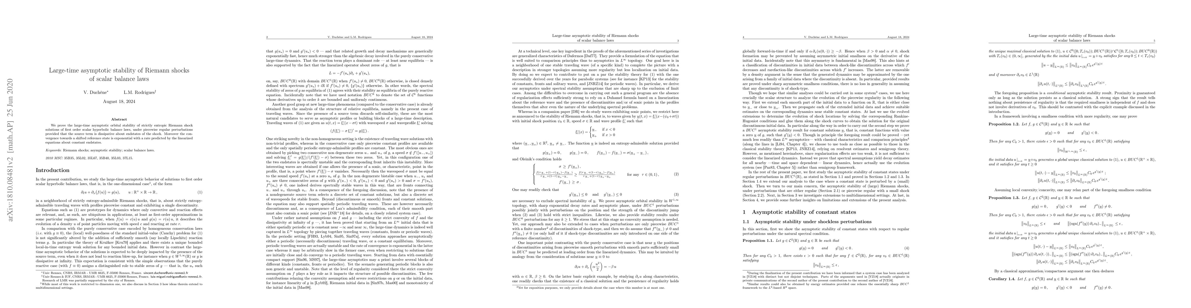 This paper proves the large-time asymptotic orbital stability of entropic Riemann shocks in scalar hyperbolic balance laws, showing exponential convergence to a shifted reference state under dissipative source terms. The stability is maintained under piecewise regular perturbations.
