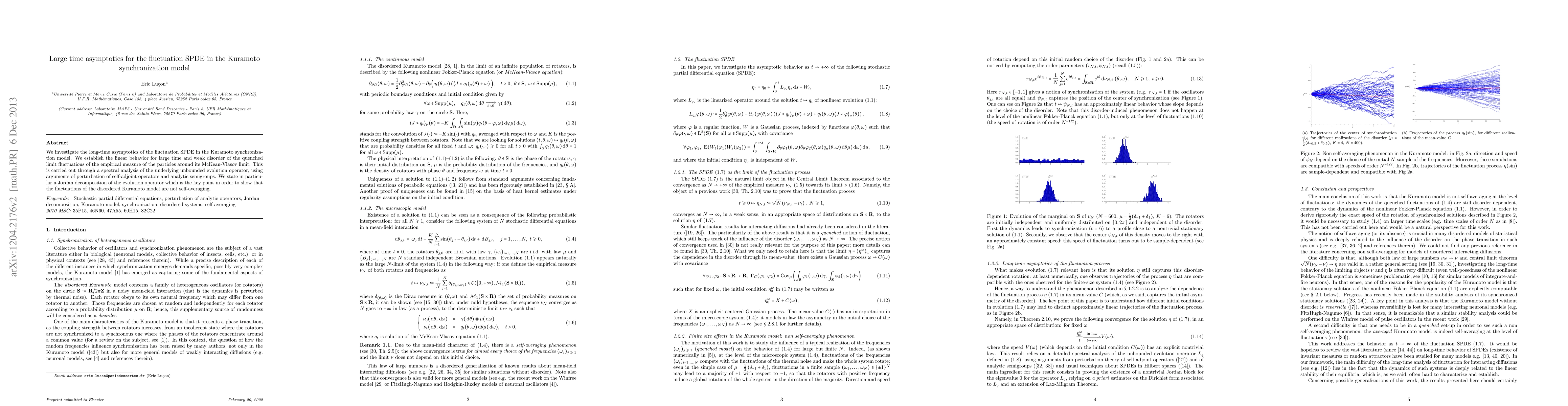 We investigate the long-time asymptotics of the fluctuation SPDE in the Kuramoto synchronization model. We establish the linear behavior for large time and weak disorder of the quenched limit fluctuations of the empirical measure of the particles around its McKean-Vlasov limit. This is carried out through a spectral analysis of the underlying unbounded evolution operator, using arguments of perturbation of self-adjoint operators and analytic semigroups. We state in particular a Jordan decomposition of the evolution operator which is the key point in order to show that the fluctuations of the disordered Kuramoto model are not self-averaging.