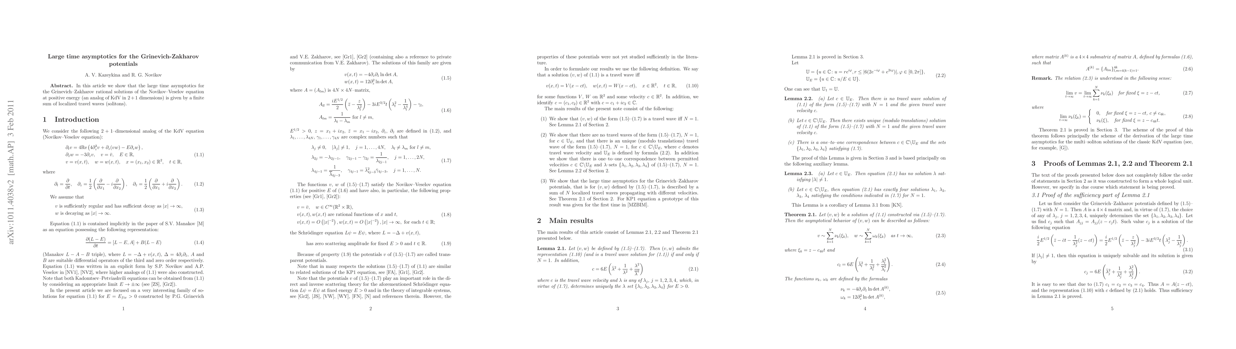 In this article we show that the large time asymptotics for the Grinevich-Zakharov rational solutions of the Novikov-Veselov equation at positive energy (an analog of KdV in 2+1 dimensions) is given by a finite sum of localized travel waves (solitons).