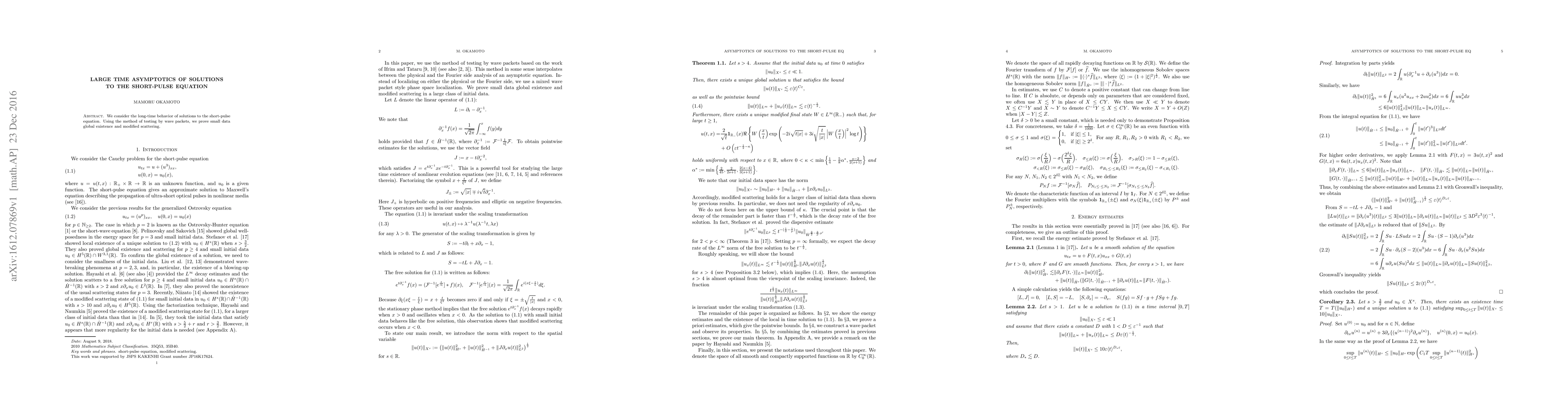 Summary: This paper investigates the long-time behavior of solutions to the short-pulse equation, demonstrating small data global existence and modified scattering through the method of testing by wave packets. The findings provide insights into the asymptotic behavior of solutions over large time scales.