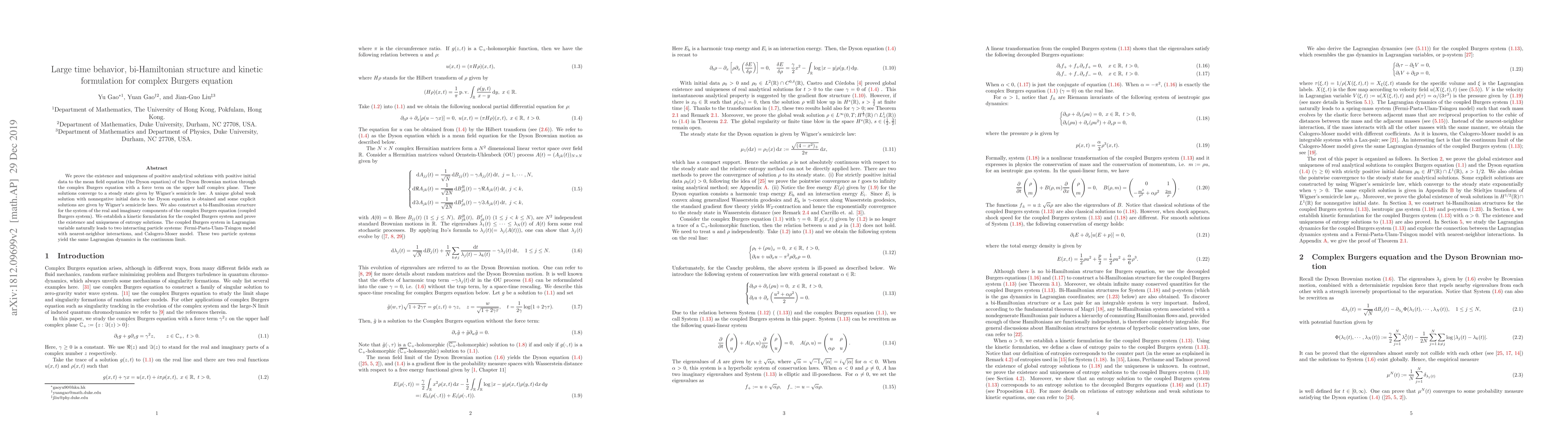 We prove the existence and uniqueness of positive analytical solutions with positive initial data to the mean field equation (the Dyson equation) of the Dyson Brownian motion through the complex Burgers equation with a force term on the upper half complex plane. These solutions converge to a steady state given by Wigner's semicircle law. A unique global weak solution with nonnegative initial data to the Dyson equation is obtained and some explicit solutions are given by Wigner's semicircle laws. We also construct a bi-Hamiltonian structure for the system of the real and imaginary components of the complex Burgers equation (coupled Burgers system). We establish a kinetic formulation for the coupled Burgers system and prove the existence and uniqueness of entropy solutions. The coupled Burgers system in Lagrangian variable naturally leads to two interacting particle systems: Fermi-Pasta-Ulam-Tsingou model with nearest-neighbor interactions, and Calogero-Moser model. These two particle systems yield the same Lagrangian dynamics in the continuum limit.