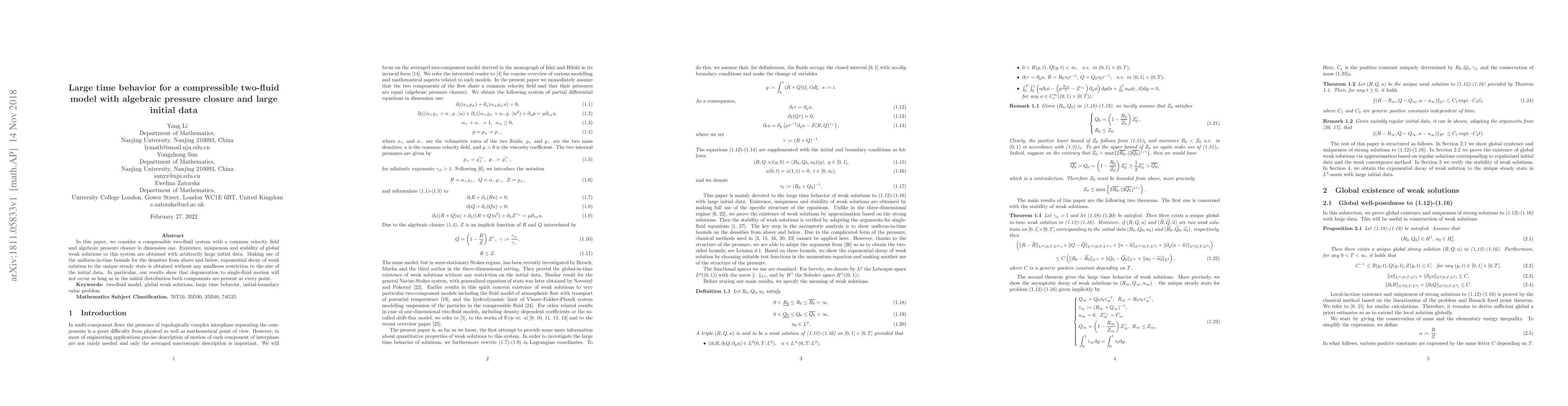 This paper establishes existence, uniqueness, and stability of global weak solutions for a compressible two-fluid model with algebraic pressure closure and large initial data. It demonstrates exponential decay to a steady state without smallness restrictions on initial data, ensuring the two-fluid system remains distinct.