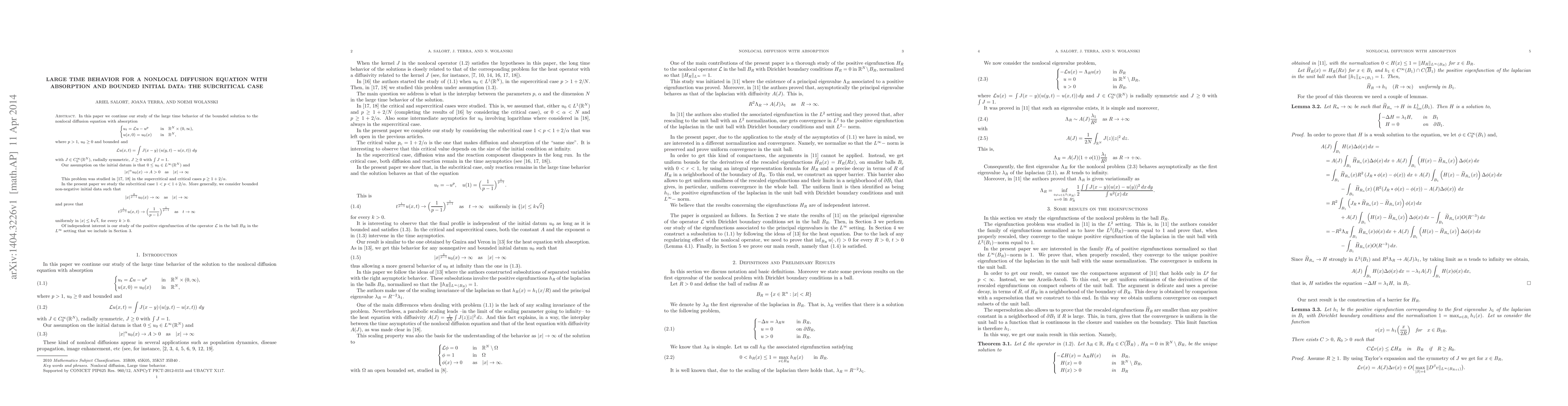 This paper investigates the large time behavior of solutions to a nonlocal diffusion equation with absorption and bounded initial data in the subcritical case where \(1 < p < 1 + 2/\alpha\). It proves that \(t^{\frac{1}{p-1}} u(x,t)\) approaches a specific constant as \(t\) tends to infinity, uniformly for \( |x|\le k\sqrt t\), for every \(k > 0\).