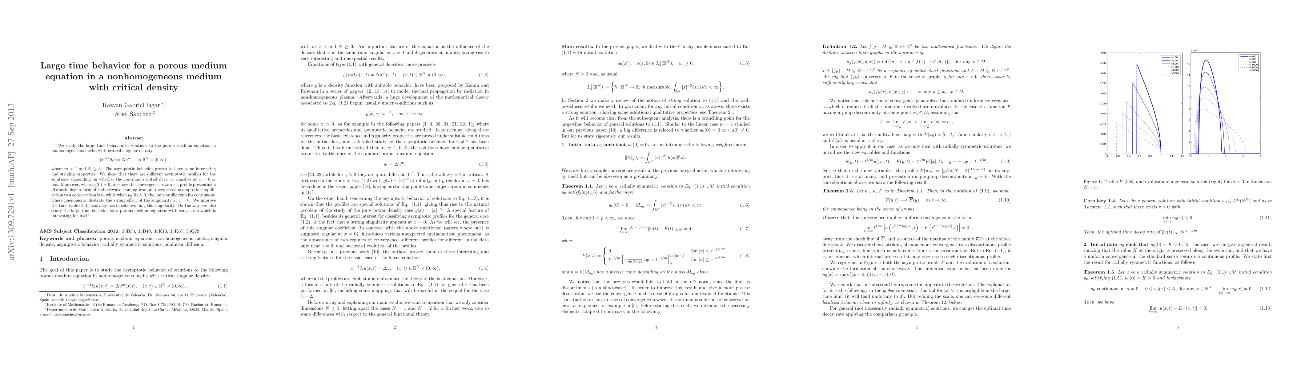 Researchers study the large time behavior of solutions to a porous medium equation in nonhomogeneous media, finding different asymptotic profiles depending on whether initial data has a discontinuity at x=0 or not.