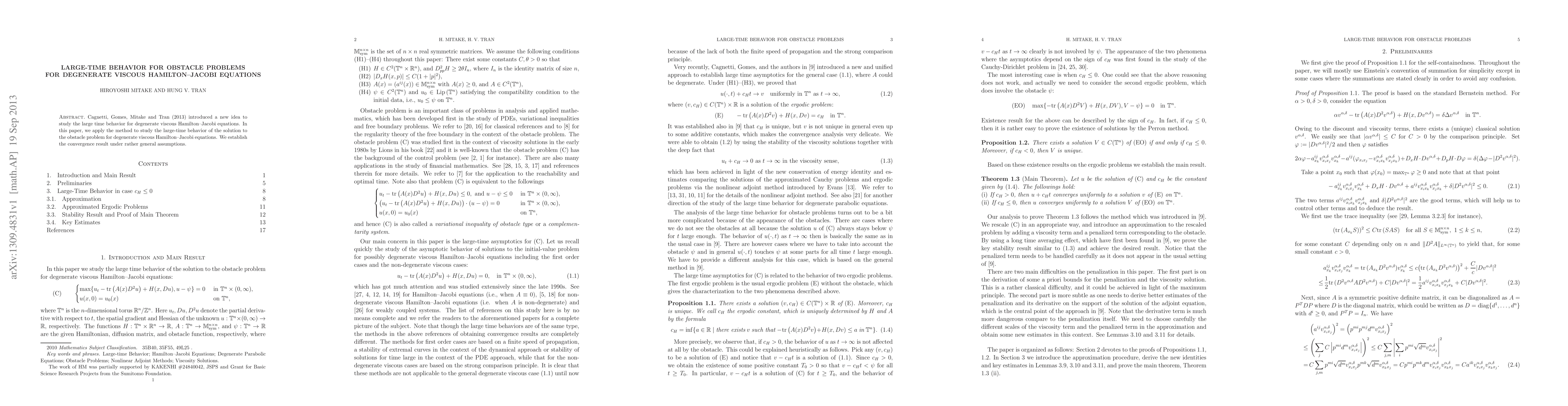 This paper studies the long-term behavior of solutions to the obstacle problem for degenerate viscous Hamilton-Jacobi equations, utilizing a method introduced by Cagnetti et al. (2013) to establish convergence results under general conditions.