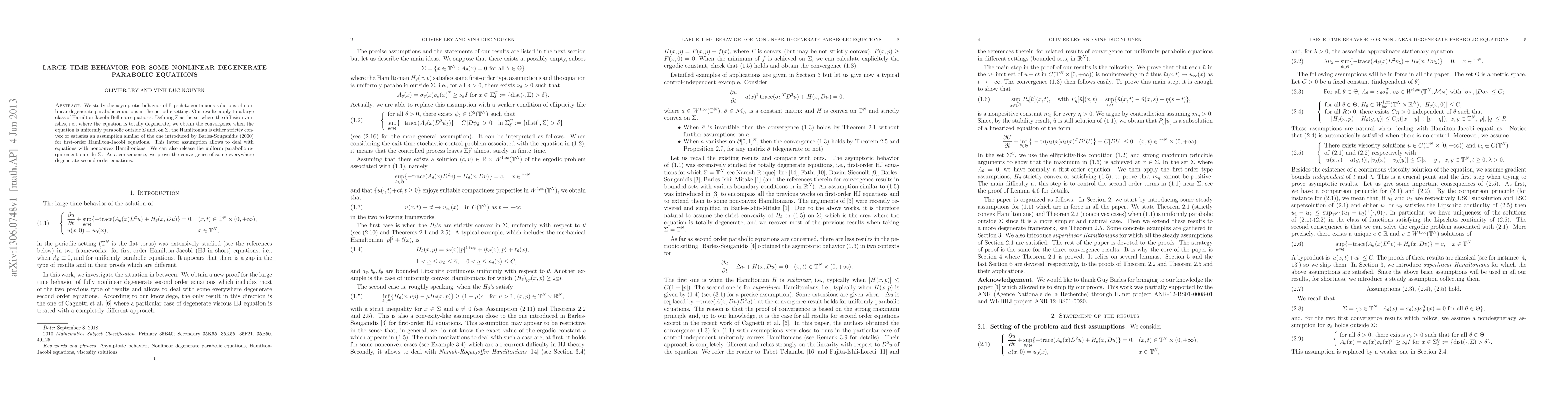 This paper investigates the asymptotic behavior of Lipschitz continuous solutions to nonlinear degenerate parabolic equations, focusing on periodic settings. It establishes convergence conditions for solutions, particularly when the equation is uniformly parabolic outside the degenerate set and the Hamiltonian is either strictly convex or meets certain assumptions, allowing for nonconvex Hamiltonians.